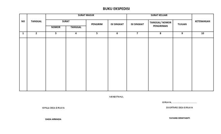 Contoh buku ekspedisi surat. Karena contoh buku ekspedisi ini merupakan contoh untuk instansi kelurahan atau desa maka buku tersebut harus ditandatangani oleh sekretaris desa dan mengetahui pejabat atasan yaitu kepala desa kuwu namun jika anda berada di intansi lain seperti sekolah maka penandatangan mengetaui atasan langsung adalah kepala sekolah dan untuk sekretaris diganti dengan kaur tu kepala tata usaha karena. Buku ekspedisi memiliki harga terjangkau dan punya kualitas yang baik. Buku ekspedisi disebut juga buku pengantar surat untuk mencatat pengiriman surat kepada pihak lain. Sekarang surat ekspedisi mulai. Buku ekspedisi atau dikenal juga sebagai buku pengantar surat adalah suatu buku yang digunakan untuk mengagendakan mencatat setiap surat yang dikirimkan kepada pihak luar. Salah satu buku ekspedisi yang banyak diminati yaitu buku ekspedisi damai.