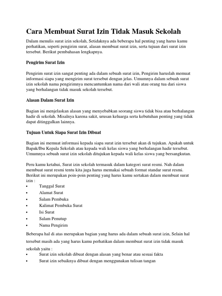 Memang terkadang kamu membutuhkan cara membuat surat izin untuk memberi tahu kepada pihak sekolah bahwa kondisi kamu yang tidak memungkinkan untuk masuk. Hanya saja banyak orang yang bingung karena tidak terbiasa membuatnya. Cara membuat surat izin tidak masuk sekolah. Meskipun sudah berusaha sebaik mungkin untuk menjaga kesehatan namun jika sudah tiba saatnya tetap saja penyakit akan datang menghampiri. Carian contoh surat rasmi tidak hadir ke sekolah.