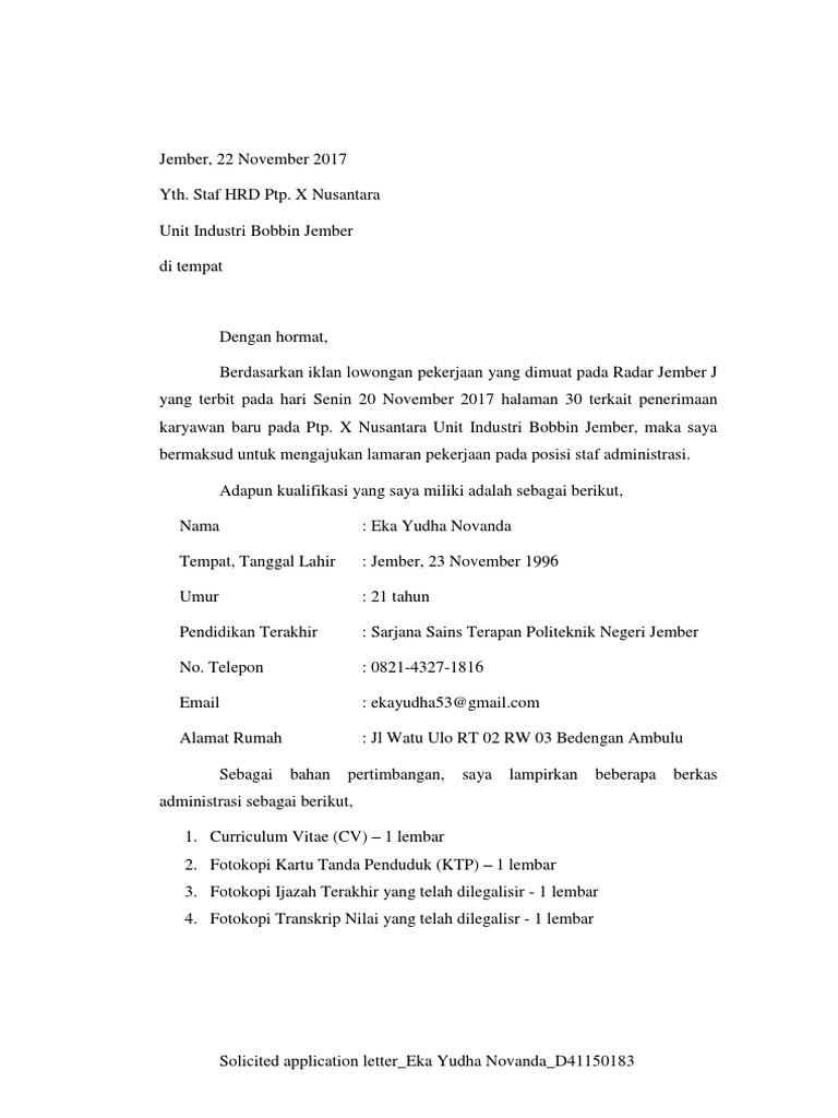 Surat yang singkat dan padat adalah contoh application letter yang tepat. Membuat application letter mengikuti urutan sebagai berikut. Surat lamaran yang dalam bahasa inggris biasa disebut sebagai application letter atau cover letter ini kerap dianggap hal tambahan tapi bukan berarti bisa dibuat secara asal. Dalam pengajuan lamaran kerja ke perusahaan surat lamaran adalah salah satu dokumen yang wajib dilampirkan. Memiliki kemampuan berbahasa inggris yang baik secara pasif dan terlebih aktif akan menambah nilai jual seseorang dalam dunia kerja. Contoh application letter dalam bahasa inggris application letter adalah syarat utama dalam melamar suatu pekerjaan.