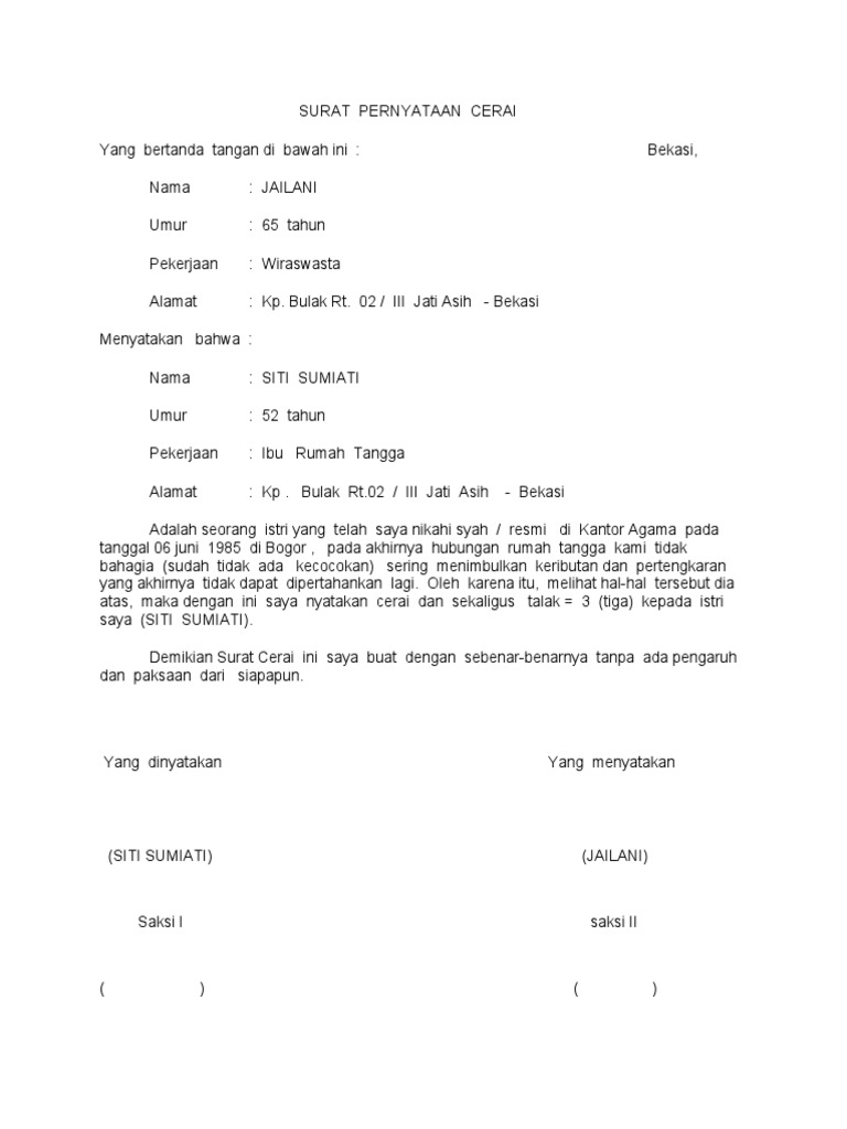 Di dalamnya biasanya terdapat nama tempat dan tanggal lahir usia alamat dan sebagainya. Pengertian talak talak secara bahasa at takhaliyatu التخلية melepaskan. Namun disini saya lebih spesifikan kepada surat cerai secara kekeluargaan. حل قيد النكاح أو بعضه melepaskan ikatan pernikahan secara menyeluruh atau sebagiannya menurut al jaziri talak ialah. Menghilangkan ikatan perkawinan atau mengurangi pelepasan ikatannya dengan menggunakan kata tertentu. Contoh surat gugatan cerai talak disertai gugatan hak asuh anak.