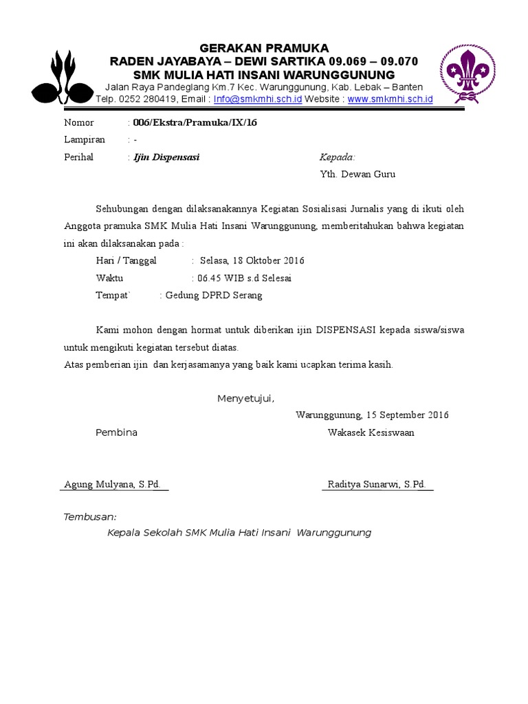 Berdasar dari hal tersebut maka kita bisa menyimpulkan tujuan dari surat dispensasi yakni untuk memberikan keringanan atas tanggung jawab yang seharunya kita kerjakan atau kita jalankan. Contoh surat resmi dalam kenyataan juga beragam. Menulis contoh surat dispensasi sebenarnya bukanlah hal yang terlalu susah. 15 contoh surat dispensasi resmi untuk berbagai tujuan berbicara mengenai dispensasi tentu akan sangat erat kaitannya dengan tanggung jawab ataupun tugas utama kita.