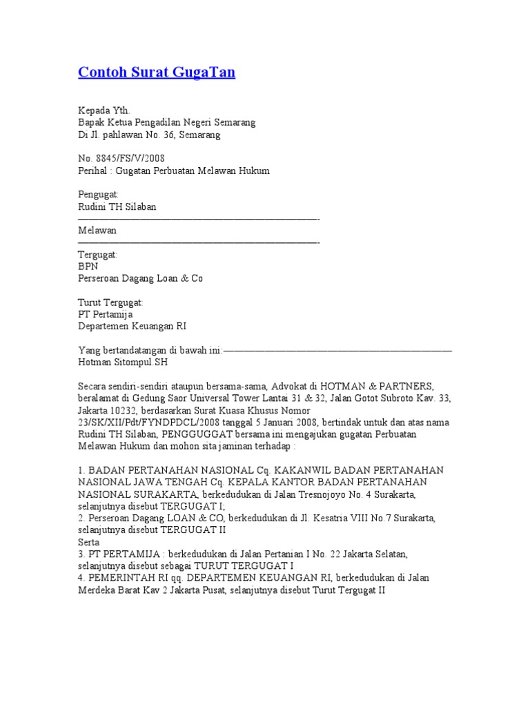 Bapak ketua pengadilan negeri kelas 1 tanjungkarang. Mohon maaf apabila terdapat kesamaan nama tempat ataupun informasi di dalamnya karena semua surat hanya bersifat percontohan saja tanpa ada maksud apapun. Kasus tanah contoh surat gugatan perdata perbuatan melawan hukum.