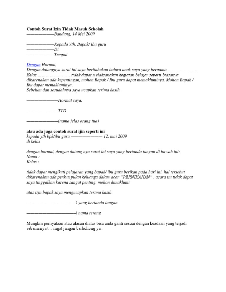 Surat izin tidak masuk sekolah mempunyai tujuan untuk memberitahukan kepada pihak sekolah bahwa siswa yang tercantum namanya di surat tersebut berhalangan hadir untuk belajar di sekolah. Hal ini karena secara umum aplikasi pesan instan memang lebih mampu menyampaikan informasi secara tepat. Lebih mudahnya kalian bisa catumkan nama sekolah kalian atau kelas kalian sekarang. Terlebih untuk urusan komunikasi pribadi misalnya. Berikut disertakan contoh surat rasmi memohon cuti daripada pihak sekolah sekiranya pelajar tidak menghadirkan diri ke sekolah tanpa sijil sakit ataupun atas alasan lain yang kukuh atau munasabah. Ada yang harus disertai dengan surat dokter ada juga yang gak asalkan gak lebih dari sehari dan lain sebagainya.