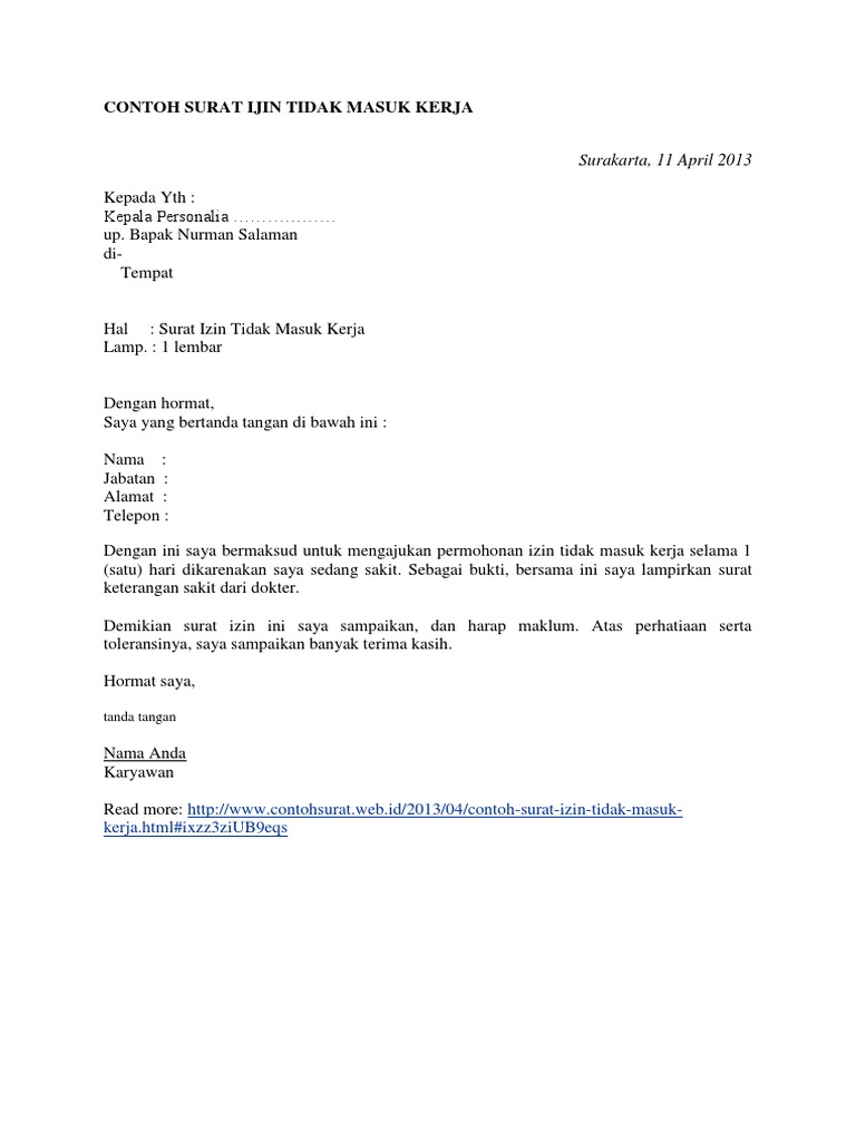 15 contoh surat izin kerja untuk karyawan dan pns sebagai seorang karyawan ataupun pegawai tentu memiliki tanggung jawab masing masing setiap harinya. Surat izin tidak masuk kerja adalah surat izin yang dibuat oleh seorang karyawan suatu perusahaan atau instansi yang ditujukan kepada atasannya yang berisi permohonan izin untuk tidak masuk kerja karena alasan tertentu misalnya karena alasan keluarga yang tidak bisa di tinggalkan misalnya ada anggota keluarga yang meninggal dunia atau musibah lainnya karena sakit karena mau menikah dan. 21 contoh surat izin tidak masuk kerja lengkap. Contoh surat izin sakit. Surat izin adalah surat yang berisi keterangan seseorang meminta izin kepada sekolah universitas tempat kerja dan lain lain karena suatu keperluan yag tidak bisa ditinggalkan contoh seperti sakit lomba dan kegiatan lainnya. Surat izin adalah salah satu surat yang berisi tentang keterangan bahwa seorang yang membuat surat tersebut untuk meminta izin pada sebuah alasan melakukan sesuatu di luar tugas wajib yang dilakukan.