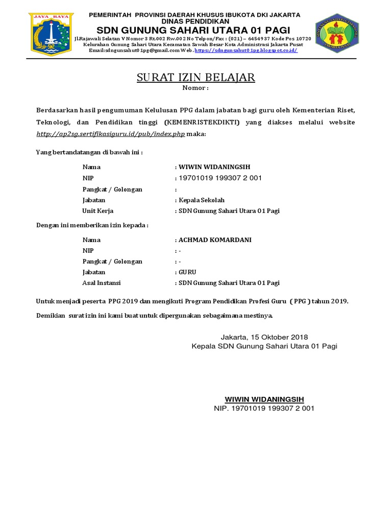 Selain pakta integritas ada beberapa persyaratan yang harus dilengkapi oleh calon peserta ppgj 2019 dan salah satunya yakni surat izin belajar kepala sekolah ketua yayasan. Format izin mengikuti ppg ppgj tahun 2019 pada postingan ini saya akan berbagi contoh format izin kepada kepala sekolah atau ketua yayasan dalam.