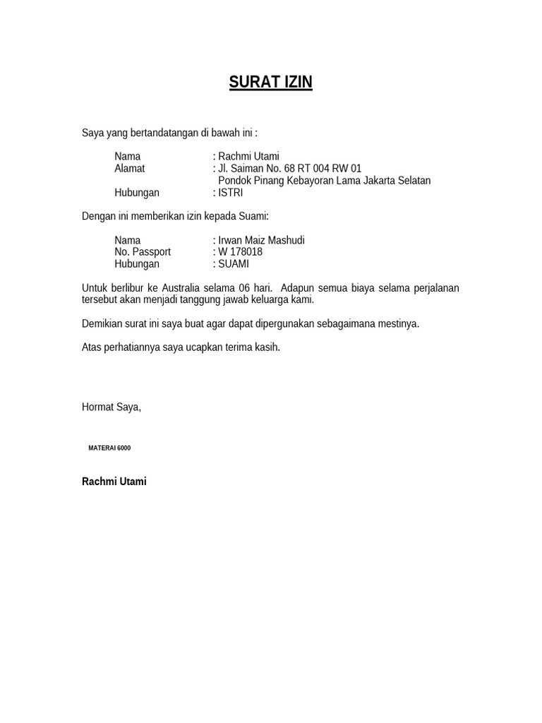 Contoh surat izin suami untuk visa dalam bahasa inggris. Surat izin suami untuk istri yang bepergian sendiri copy ktp suami.