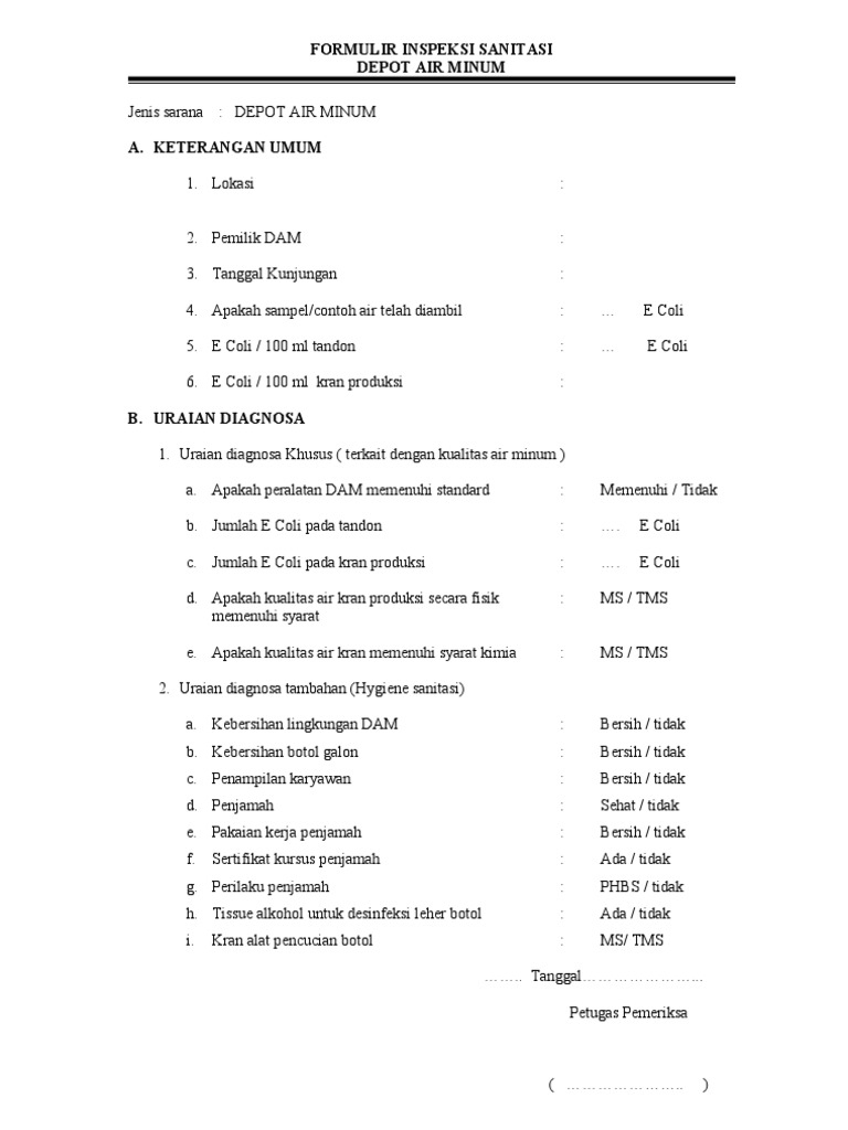 Pasal 11 1 tim pemeriksa sebagaimana dimaksud dalam pasal 9 ayat 2. Persyaratan izin usaha depot air minum. Itulah yang dapat kami bagikan terkait contoh surat izin usaha depot air minum. Input dari permohonan ini tentunya berupa surat izin depot air minum isi ulang. Contoh surat izin depot air minum. Inilah yang dapat kami bagikan tentang contoh surat izin usaha depot air minum.