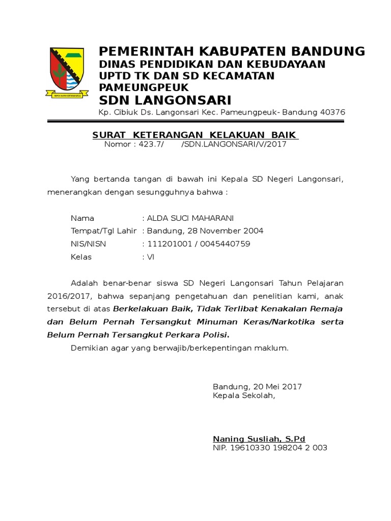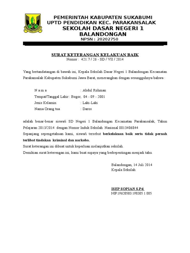 Contoh surat kelakuan baik dari sekolah sd. Berikut ini adalah kode administrasi dalam surat menyurat yang merupakan kumpulan file dari berbagi sumber administrasi tentang surat keterangan kelakuan baik dari sekolah sd yang bisa bapakibu gunakan dan diunduh secara gratis dengan menekan tombol download biru dibawah ini. Contoh surat kelakuan baik siswa tahun 2018 pada postingan ini saya akan share contoh surat keterangan kelakuan baik siswa untuk jenjang sd smp sma smk tahun 2018 tahu tahun pelajaran 20172018 yang bisa anda download secara gratis. Surat keterangan kelakuan baik nomor. Inilah surat keterangan kelakuan baik dari sekolah sd. Sahabat brankas arsip yang budiman. Contoh surat akuan kelakuan baik demikian surat pernyataan kelakuan baik ini saya buat dengan benar.