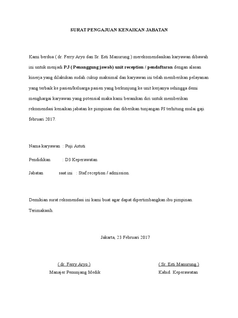 Contoh surat kenaikan jabatan karyawan. Surat pengangkatan karyawan formal dan lengkap. Setelah melakukan beberapa evaluasi terhadap kinerja karyawan terhitung mulai tanggal 1 april 2016 dengan jabatan sebagai management trainee pt. Itulah contoh surat pengajuan kenaikan jabatan karyawan yang dapat admin kumpulkan. Ya ada banyak perusahaan yang mempekerjakan karyawan dengan status kontrak. Contoh surat resmi untuk rekomendasi kenaikan gaji pangkat dan jabatan anda apakah anda ingin kenaikan gaji jabatan pangkat tapi bingung bagaimana caranya. Contoh surat pengangkatan karyawan yang dijelaskan kali ini adalah beberapa model surat pengangkatan yang bisa diambil untuk dijadikan surat pengangkatan di manajemen atau perusahaan tertentu.