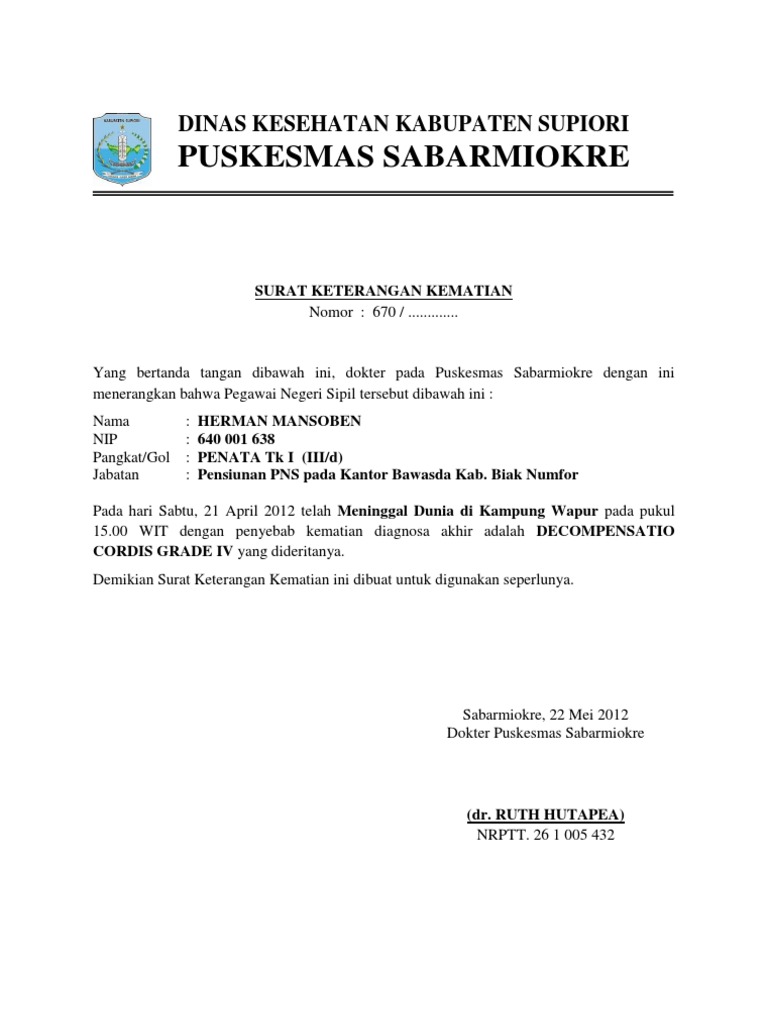 Contoh surat keterangan kematian dari rumah sakit. Terkadang untuk pengurusan pemakaman kita membutuhkan surat keterangan kematian dan biasanya surat yang digunakan untuk pemakaman ini dikeluarkan oleh dokter di rumah sakit rt atau rw setempat atau bisa dari desa. Contoh surat keterangan kematian dari rumah sakit yang dapat anda download gratis sebagai referensi format dalam membuat keterangan meninggal seseorang. Format surat keterangan kematian pada umumnya berisi nama tempat tanggal lahir umur status dan alamat. Surat kematian dari rumah sakit jika meninggal di rumah sakit 3. Surat pernyataan dari ahli waris jika meninggal di rumah sendiri 4. Contoh surat keterangan kematian 2 adalah surat keterangan kematian yang diterbitkan oleh dinas kependudukan dan catatas sipil disdukcapil yang biasa digunakan untuk mengajukan pencairan dana asuransi jiwa pembagian hak waris dl.