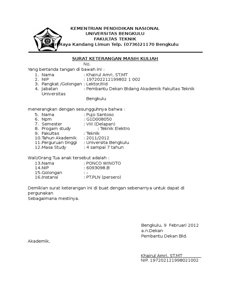 Tapi ada pula di sebagian kampus pihak yang memberikan surat keterangan kuliah ini adalah kepala baak bagian akademik dan administrasi kemahasiswaan. Contoh surat keterangan kuliah surat keterangan kuliah adalah surat keterangan yang dikeluarkan oleh suatu universitas atau perguruan tinggi yang isinya adalah menyatakan bahwa seseorang masih tercatat sebagai mahasiswa aktif di perguruan tinggi tersebut.