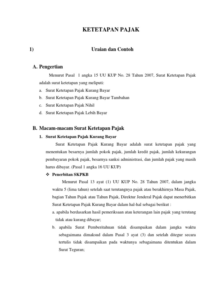 Contoh surat ketetapan pajak. Sedangkan surat ketetapan pajak skp adalah formulir pajak yang dipergunakan oleh kantor pajak untuk melakukan penagihan atas pajak yang kurang atau lebih dari yang dibayarkan. Surat ketetapan pajak adalah catatan informasi keuangan suatu perusahaan pada suatu periode akuntansi yang dapat digunakan untuk menggambarkan kinerja perusahaan tersebut. Apabila berdasarkan hasil pemeriksaan catatan 2 direktur jenderal pajak menerbitkan surat ketetapan pajak kurang bayar jumlah kekurangan pajak ditambah dengan sanksi administrasi berupa kenaikan sebesar 100 dari jumlah kekurangan. Apa yang dimaksud dengan surat tersebut. 28 tahun 2007 pasal 1 nomor 15 adalah. Surat ketetapan pajak kurang bayar skpkb.