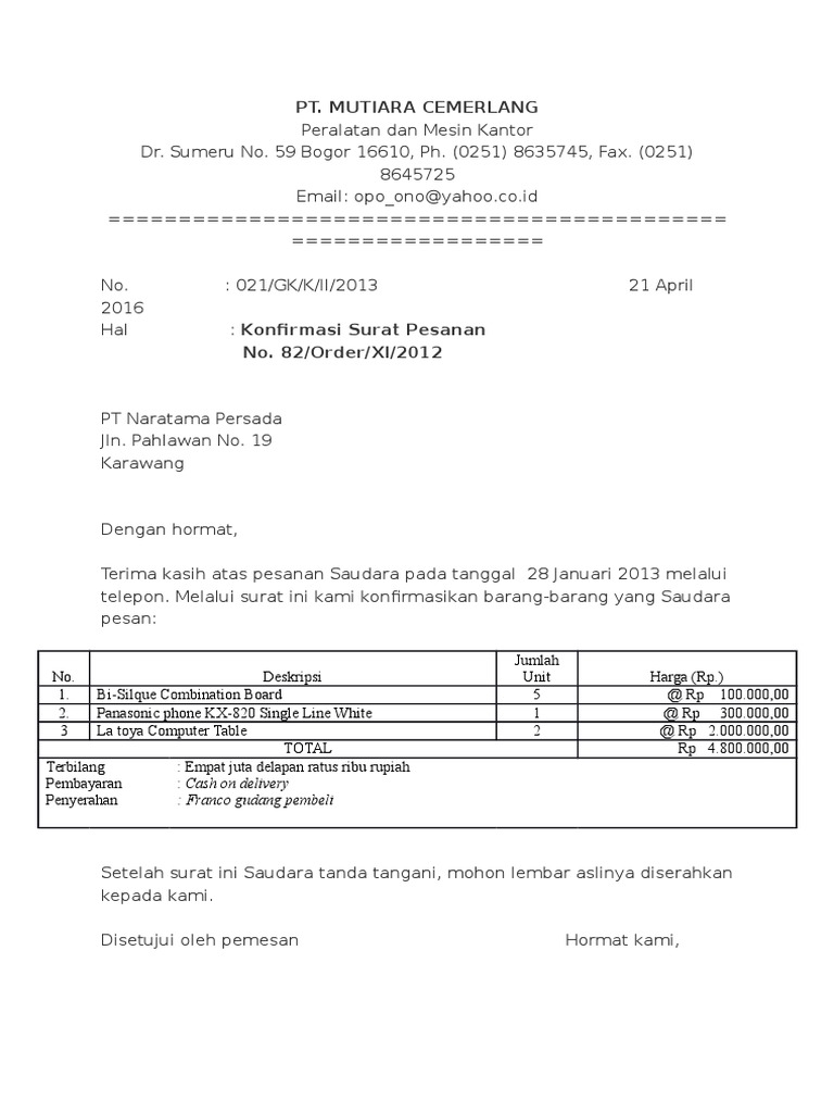 Contoh surat konfirmasi pesanan barang. Surat yang digunakan oleh perusahaan biasanya berupa surat bisnis yakni surat surat resmi yang digunakan demi kelancaran dan kemajuan perusahaan tersebut. Agar tidak salah persepsi surat konfirmasi pengiriman yang dimaksud di sini adalah surat yang berisi pemberitahuan tentang sudah dikirimnya barang barang sesuai dengan pesanan yang masuk sebelumnya. Nama kota dan tanggal merupakan nama kota dimana surat tersebut diterbitkan dan tanggal dari penerbitan surat tersebut. 15 contoh surat pesanan barang dan jasa yang baik dalam menjalankan sebuah perusahaan maka tentu para karyawan atau atasannya seringkali menggunakan berbagai jenis surat resmi setiap harinya. 13 cikutra bandung telp. Inilah yang akan menjadi topik pembahasan kita kali ini yaitu tentang contoh surat pesanan yang baik dan benarapa itu surat pesanan.