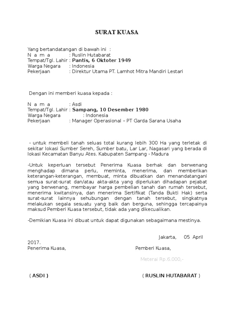 Contoh surat kuasa pembelian tanah. 99 cibinong bogor tidak ada seorang pun yang berhak memasarkan tanah tersebut atau menjual selain bapak sulamun apabila tanah tersebut laku terjual maka bapak sulamun akan diberikan presentase sebesar 3 dari harga penawaran tanah sebesar 200. 134 seri 2453a yang terletak di jl. Untuk keperluan yang diberi kuasa dikuasakan untuk menghadap kepada pejabat yang berwenang diantaranya ppat dan notaris memberikan keterangan ke terangan membuat suruh membuat menandatangani surat surat pentingakta jual beli membayar atas harga tanah yang dibeli tersebut di atas meminta kuitansitanda terima lainnya menerima segala sesuatu yang dibeli dari penjual se lanjutnya. Jika anda tidak memiliki kesempatan untuk merawat dan menjaga tanah tersebut maka anda bisa memberikan kuasa kepada orang lain. Contoh surat kuasa no. Beberapa hal penting yang tertera di surat perjanjian jual beli tanah mungkin akan terdengar awam dan sulit di mengerti.