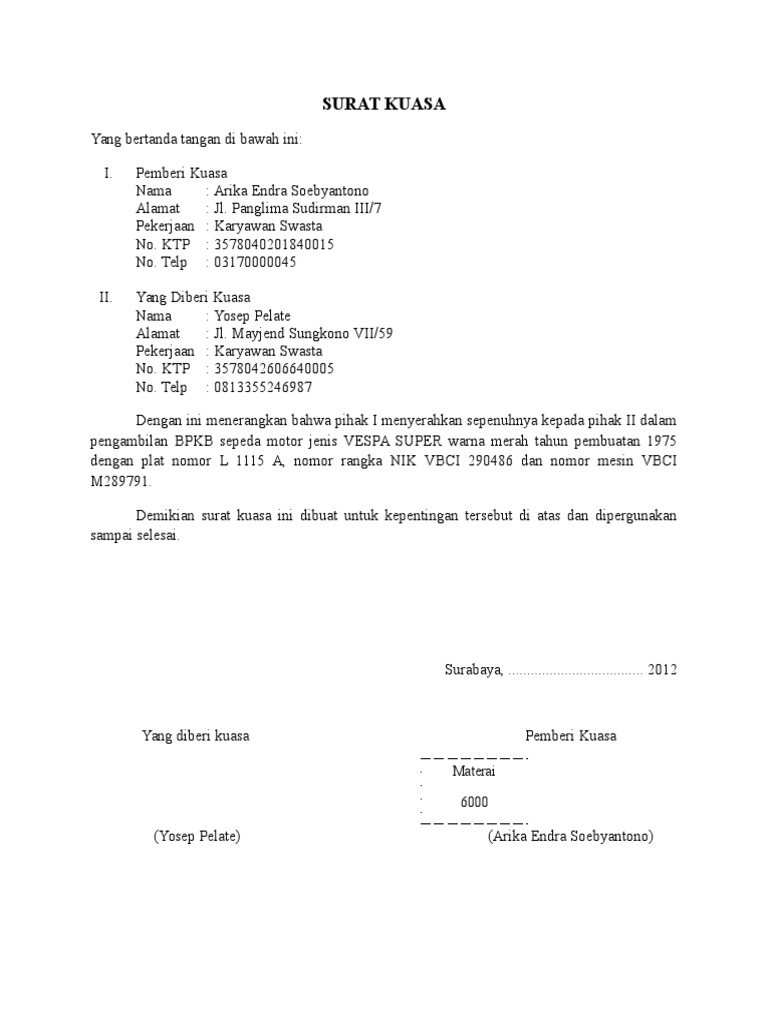 Contoh surat kuasa pengambilan bpkb sepeda motor. Sebagai bahan contoh anda bisa melihat contoh surat kuasa pengambilan bpkb sepeda motor mobil di bawah ini. Surat kuasa kedinasan surat kuasa kedinasan adalah surat kuasa yang dibuat oleh suatu perusahaan atau instansi baik pimpinan maupun pejabatnya yang diberikan kepadan bawahannya untuk melakukan pekerjaan yang berhubungan dengan perusahaan atau instansi tersebut. Contoh surat kuasa sepeda motor contoh surat kuasa pengambilan bpkb sepeda motor jika anda sudah membeli kendaraan berupa sepeda motor namun tidak memiliki waktu untuk mengambil bpkb nya maka tidak perlu khawatir. Cukup sekian dan terima. Download contoh surat kuasa pengambilan bpkb format doc. Demikian pemaparan sekaligus contoh surat kuasa pengambilan bpkb.
