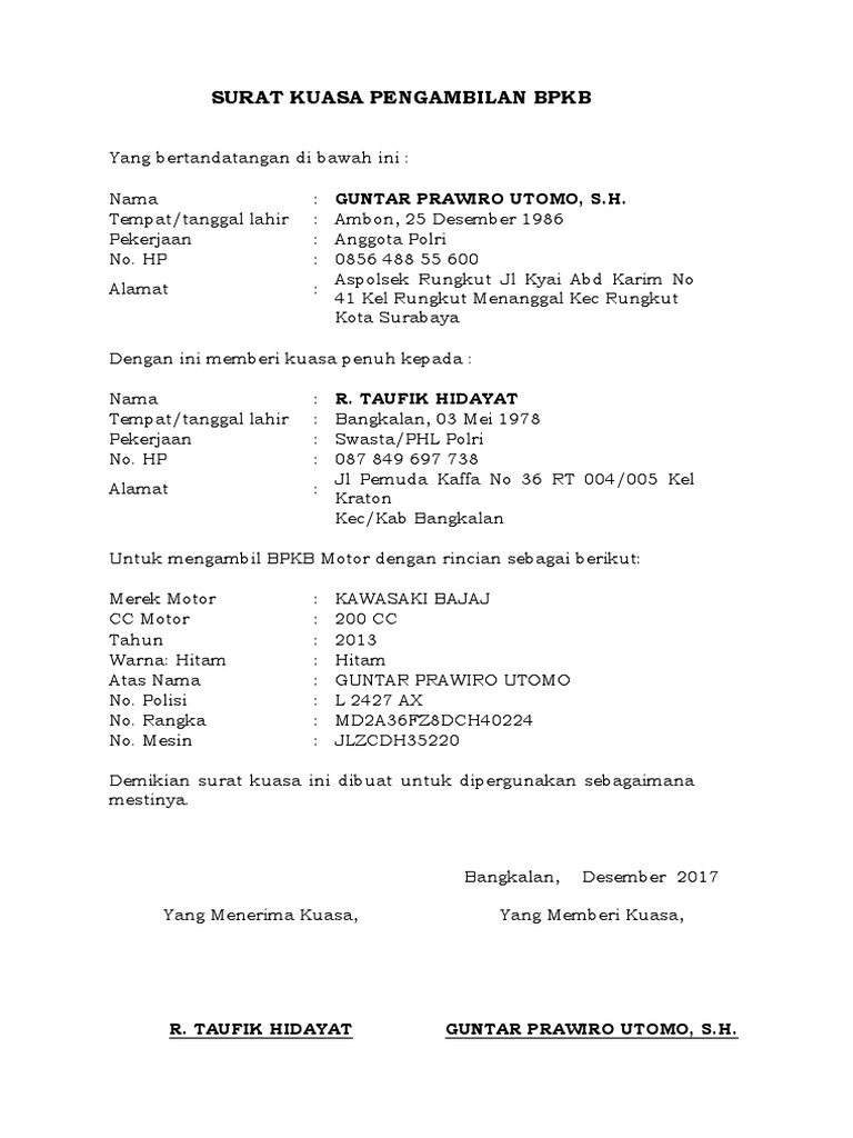 Sehingga kita meminta bantuan orang lain saudara suami ataupun teman untuk mengambil bpkb motor atau mobil kita. Contoh surat kuasa no. Jika anda membeli kendaraan bermotor dari showroom atau dealer maka tentu akan mendapatkan bpkb sebagai bukti kepemiliki anda atas kendaraan bermotor tersebut.