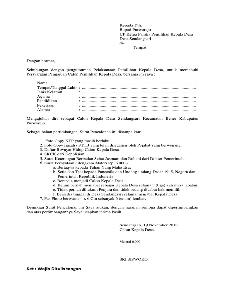 Contoh surat lamaran calon kepala desa. Dan pergunakanlah portal ini sebaik mungkin untuk sara media berbagi untuk kita semua. Demikianlah contoh surat lamaran calon kepala desa semoga dapat memberikan manfaat bagi pembaca semua dan kami barharap anda dapat melakukan sumbang saran untuk kemajuan portal ini. Contoh format surat permohonan pencalonan perangkat desa terbaru berikut ini merupakan sebuah form surat permohonan contoh surat permohonan pencalonan perangkat desa terbaru sesuai dengan undang undang yang berlakuperangkat desa merupakan seorang pejabat pemerintahan desa yang mana pada akhir akhir ini jabatan ini banyak sekali orang yang memburu selain dana desa yang semakin lama. Terbukti selama 4 tahun terakhir dalam penyelenggaraan pemilihan kepala desa pilkades minat warga desa untuk ikut mencalonkan diri sebagai kepala desa relatif meningkat. Contoh surat lamaran kerja untuk calon kepala desa jika dulu profesi jabatan kepala desa belum banyak dilirik namun tidak dengan saat ini. Surat ini ditujukan kepada ketua panitia pemilihan kepala desa pilkades yang sebelumnya telah dibentuk oleh badan permusyawaratan desa bpd.