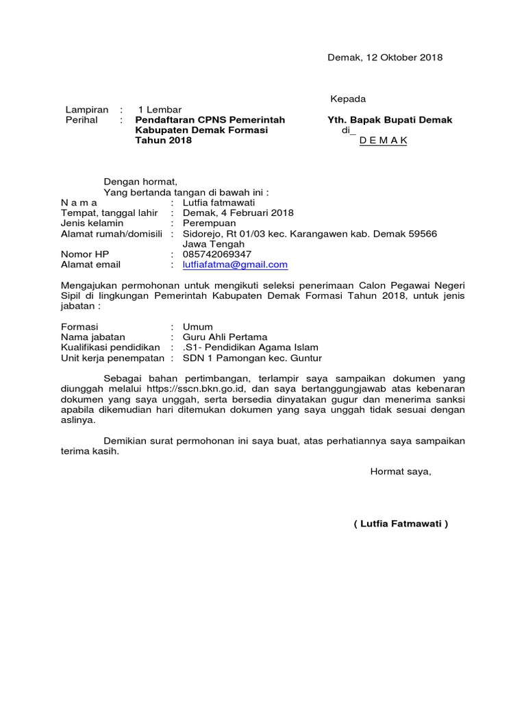 Jawa tengah dari pelamar umum tahun 2018 gubernur jawa tengah di s e m a r a n g memperhatikan pengumuman penerimaan cpns pemerintah provinsi jawa tengah nomor 8000016246 tanggal 19 september 2018 bersama ini dengan hormat kami yang. Contoh surat lamaran cpns 2019.