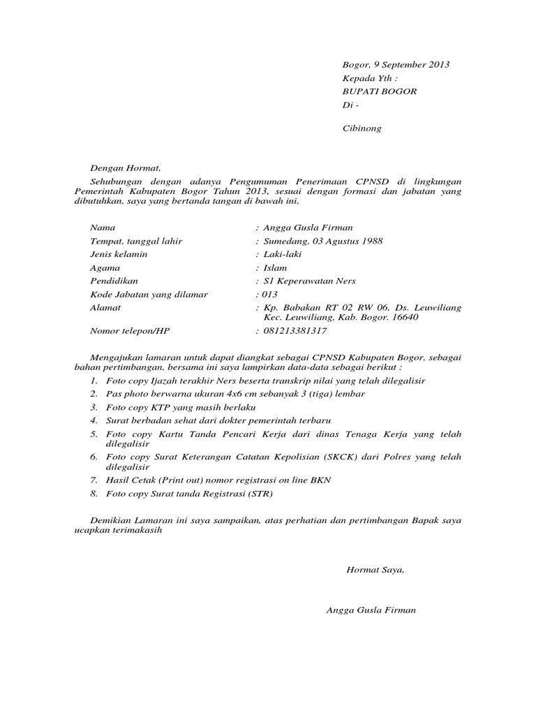Contoh surat lamaran cpns kabupaten bogor. Contoh surat lamaran kerja cpns terbaru 2015 buat anda yang ingin melamar kerja di cpns maka membuat surat lamaran tidak boleh asal buat saja dan ada setruktur yang harus anda ketahui juga maka dengan ini kami blog contoh surat dan proposal memberikan info ini buat anda semua supaya anda bisa di terima lamaran kerja cpns anda nantinya. Membuat surat pernyataan dalam melamar cpns bagi yang belum pernah memang sedikit susah. Tahun ini kemendikbud membuka 2196 formasi. Sudah di umumkan informasi terkait seleksi cpns kabupaten bogor 2019 seperti admin kutip dari akun sosmed bkn. Pengumuman hasil seleksi terbuka jabatan tinggi pratama di lingkungan pemerintah kabupaten bogor tahun 2020. Sebenarnya calon peserta seleksi cpns juga bisa mengunduh melalui images for contoh surat lamaran cpns 2018.