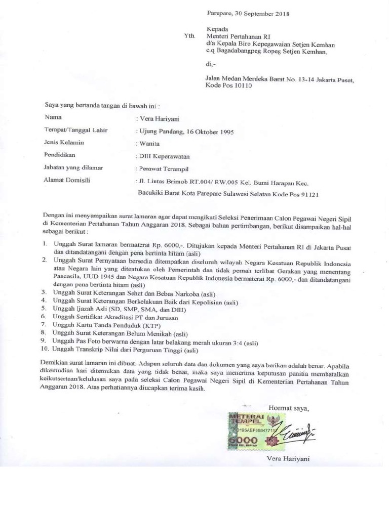 Contoh surat lamaran cpns kemhan. Kemhan kembali membuka pendaftaran cpns 2019 setelah pada rabu 20112019 sempat tutup. Pendaftaran cpns juga tidak terlalu susah karena bisa dilakukan secara online. Cpns kemenkumham 2019 kemenkumham membuka lowongan cpns 2019 sebanyak 4598 formasi. Revisi lampiran pengumuman cpns 2019 penambahan keterangan formasi khusus cumlaude dan putraputri papua download. Format contoh surat lamaran cpns 2019 di kemenkumham kemenag dan kemenlu bisa dilihat di bagian bawah artikel ini. Format surat lamaran cpns kemhan materai rp6000 author.