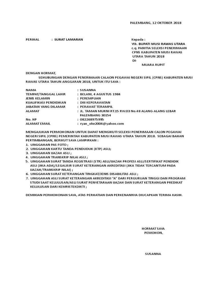 Contoh surat lamaran cpns musi rawas. Musi rawas formasi tahun 2019. 23 sep 2018. Sabtu 01 agustus 2020. Dokumen yang dibutuhkan masih menunggu konfirmasi lanjut dari pemerintah. Jadwal pelaksanaan seleksi penerimaan cpns kab. Surat lamaran dan surat pernyataan cpns tahun 2019 surat lamaran dan surat pernyataan pelamar cpns tahun 20192020 berbeda beda antara satu instansi dengan instansi lainnya.