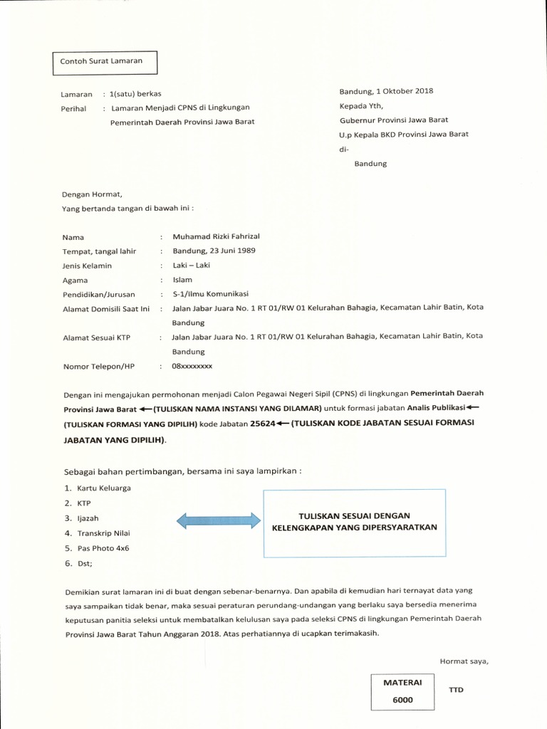 Nah bagi anda yang sedang membutuhkan referensi tentang bagaiman cara membuat surat pernyataan cpns berikut ini kami sediakan contoh surat pernyataan cpns untuk lulusan sma di salah satu kementerian yang kebetulan di tahun 2018 ini sedang membuka pendaftaran cpns. Contoh surat lamaran menjadi cpns pemprov sumbar 2019. Digunakan atau tidak semuanya bergantung pada kebijakan instansi yang anda lamar atau anda pilih pada saat mendaftar cpns. Surat lamaran kepada gubernur sumatera barat cq kepala badan kepagawaian daerah dibuat diatas kertas double folio dengan tulisan tangan sendiri tinta hitam dan ditandat. Contoh surat lamaran kerja guru terlepas dari membuat surat lamaran kerja yang baik penting untuk mengetahui anda ingin melamar jadi apa dan dimana nantinya apakah di perusahan atau untuk menjadi cpns. Contoh surat lamaran dapat ditemukan pada situs bkdsulbarprovgoid.