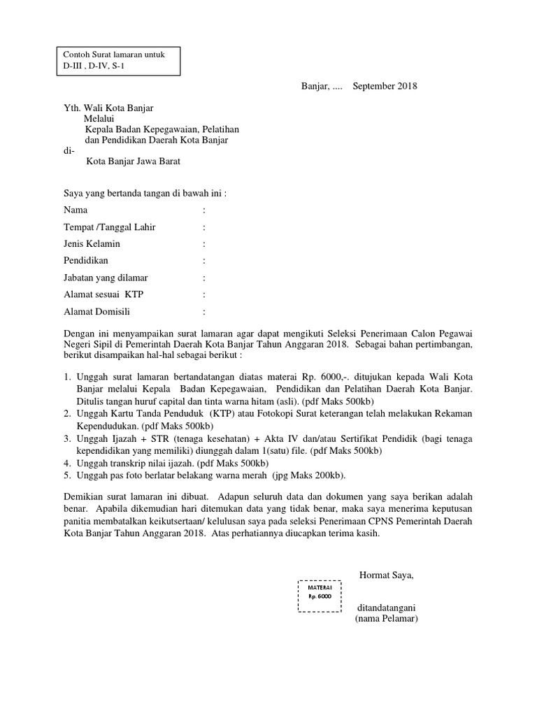 Isi surat lamaran itu sendiri tidak jauh berbeda. Selain itu juga dibuka formasi khusus untuk jalur cumlaude dan disabilitas. Surat lamaran adalah surat resmi yang ditujukan kepada sebuah perusahaaninstansi dengan tujuan untuk mengajukan diri sebagai pekerja atau dalam hal pns adalah abdi negara. 15 contoh surat lamaran kerja pns yang baik dan benar menjadi pegawai negeri sipil tentunya menjadi harapan sebagian besar masyarakat.