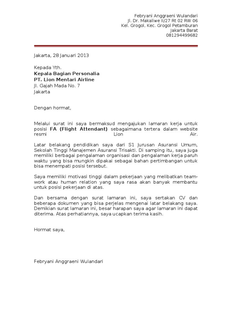 Contoh surat lamaran di pt lion air. Dan pergunakanlah portal ini sebaik mungkin untuk sara media berbagi untuk kita semua. Contoh surat lamaran lion air contoh surat lamaran kerja ke penerbangan airlines contoh contoh surat lamaran kerja ke pene. Contoh surat lamaran lion air. Kumpulan contoh surat lamaran kerja yang baik dan benar dari a z. Surat lamaran kerja adalah jenis surat resmi yang ditujukan kepada. Kumpulan contoh surat lamaran kerja yang baik dan benar dari a z.