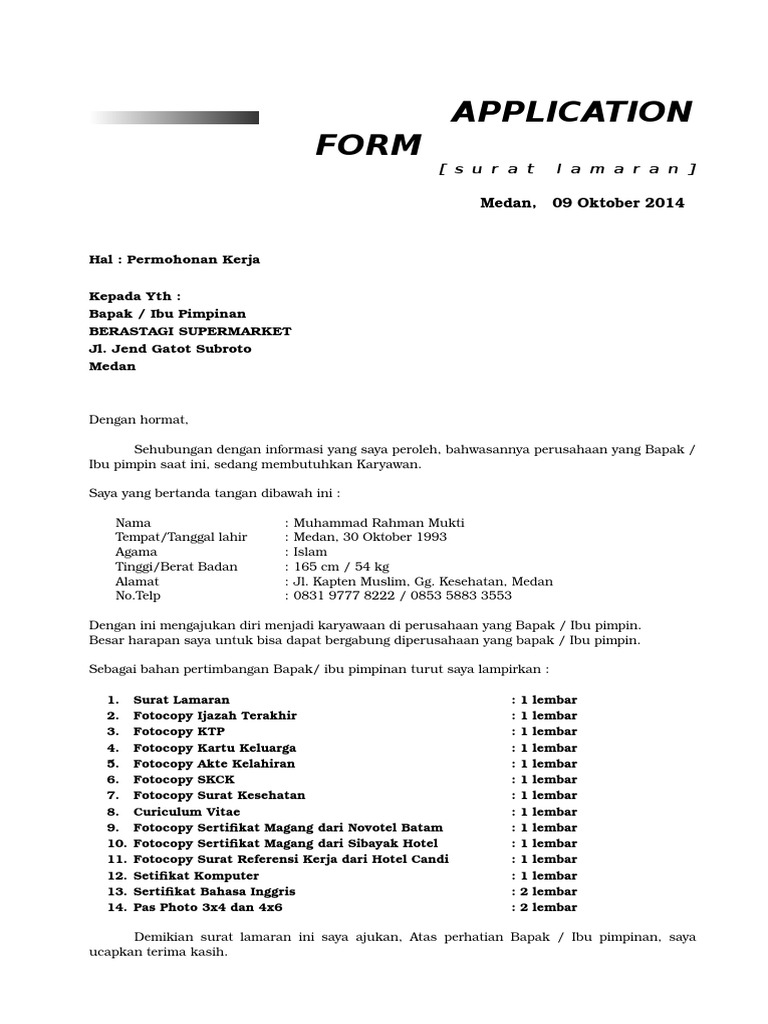 Contoh surat lamaran di supermarket. Contoh surat lamaran kerja di perusahaan seringkali dicari oleh para pencari kerja yang ingin mengajukan lamaran pekerjaan di perusahaan perusahaan yang ada di indonesia. 123 yogyakarta dengan hormat bersama dengan surat. Contoh surat lamaran kerja pt lion superindo merupakan sebuah postingan yang akan kami bagikan pada kesempatan ini. Contoh surat lamaran karyawan toko supermarket dewasa ini banyak toko atau swalayan di beberapa kota besar buka banyak lowongan kerja sbg karyawan toko hal semacam ini sbg bentuk dng membaiknya perekonomian indonesia. Meski begitu surat resmi tidak harus selalu dibuat oleh kelompok bisa jg dibuat oleh individu. Contoh surat lamaran kerja membuat surat lamaran kerja tidak boleh asal dalam membuatnya membutuhkan acuan sebagai referensi contoh surat lamaran kerja ini adalah salah satu bahan yang bisa dijadikan acuan dalam membuat surat lamaran pekerjaan.