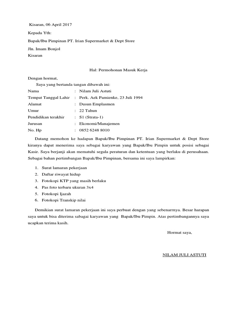 Contoh surat lamaran di swalayan. Berbicara mengenai tugas karyawan toko memang bisa dibilang gampang gampang susah pasalnya selain harus bisa membentuk kepercayaan pelanggan. Panduan langkah bikin surat lamaran kerja karyawan toko yg baik benaryang pertama adalah dng bikin surat lamaran kerja anda tampak profesional juga gampang di baca hal semacam ini begitu utama utk diingat mengingat bila anda tak dapat bikin surat lamaran kerja yg tak profesional jadi hal itu dpt bikin surat lamaran anda tidak diterima oleh toko swalayan yg anda lamar selain itu juga. Contoh surat lamaran kerja sebagai kasir jika kalian kesulitan dalam menulis surat lamaran kerja tenang saja karena di dalam tulisan ini akan membahas dan memberikan contoh surat lamaran kerja kasir jadi kalian tidak usah terlalu pusing untuk membuat surat lamaran kerja sebagai kasirtulisan ini ditunjukan bagi kalian yang memang memiliki minat dan ingin bekerja sebagai kasir di suatu. Contoh surat lamaran kerja ini saya buat kepada para pencari kerja agar bisa digunakan untuk melamar pekerjaan diperusaaan sesuai dengan posisi yang dibutuhkan oleh perusahan yang sedang membuka lowongan pekerjaan. Terdapat berbagai contoh surat lamaran kerja berdasarkan iklan paling lengkap yang bisa diikuti langkah. Lowongan pekerjaan tidak hanya diinformasikan lewat media sosial saja tapi masih banyak lowongan pekerjaan yang diinfokan lewat iklan.