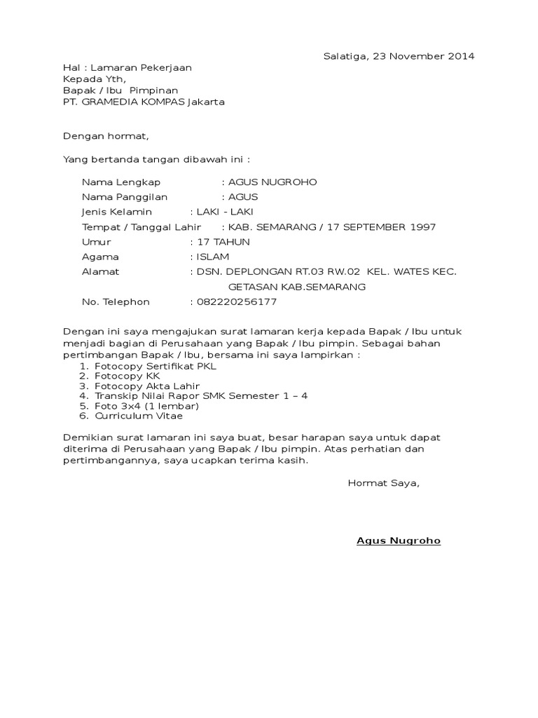 Dulu surat lamaran kerja memang selalu dikirimkan lewat pos atau diantar langsung ke perusahaankantor. Nah jika anda juga berencana melamar pekerjaan di perusahaan maka contoh surat lamaran kerja di persuahaan yang akan saya bagikan di bawah ini patut anda simak. Contoh surat lamaran kerja adalah suatu hal yang sangat dibutuhkan oleh para orang yang sedang mencari pekerjaan yang sesuai dengan keinginannya. Hampir semua kategori buku tersedia mulai dari buku pendidikan buku motivasi buku komputer buku resep buku otomotiv buku anak anak dan masih banyak lagi jenis lainnya. 16 contoh surat lamaran kerja via email terbaru yang baik dan benar di era modern seperti saat ini contoh surat lamaran kerja via email lebih banyak dicari oleh mereka yang saat ini tengah mencari pekerjaan. Contoh surat lamaran kerja di toko gramedia dibutuhkan bagi pelamar yang ingin melamar pekerjaan di gramedia.
