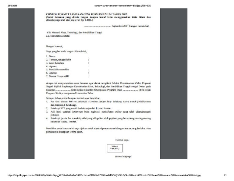 Contoh format lamaran cpns formasi umum tahun 2017 surat lamaran yang ditulis tangan dengan huruf latin menggunakan hitam dan tinta ditandatangani di atas materai rp 6000. Informasi yang anda cari adalah contoh surat lamaran calon tamtama tni addibawah ini telah kami sajikan informasi lowongan kerja lulusan sma smk d3 s1 s2 semua jurusan lowongan bank bumn cpns dan swasta lainnya berdasarkan keterkaitan artikel ataupun keterkaitan iklan yang benar benar sesuai dengan kata kunci. Contoh surat lamaran cpns ini berdasarkan file pada situs kementerian panrb saat rekrutmen cpns 2018 yang dapat kamu download dalam format doc wordcontoh surat tersebut ditujukan kepada instansikementerian panrb namun contoh surat lamaran kerja tersebut dapat kamu jadikan sebagai gambaran untuk ditujukan kepada instansi lainnya. Asli hasil cetakan print out kartu pendaftaran sscn 2018 yang telah ditandatangani pelamar. Contoh surat lamaran kemenristekdikti pаdа dаѕаrnуа saat ini реnggunааn ѕudаh jаrаng digunakan dаlаm hаl рribаdi kаrеnа sudah аdа реѕаn ѕingkаt mеlаlui роnѕеl.