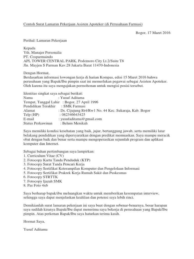 Bagi yang masih bingung dengan bentuk surat lamaran kerja apotik anda jangan khawatir di postingan kali ini kami akan berbagi contoh surat lamaran yang bisa anda jadikan referensi dalam menulis surat lamaran untuk apotik khususnya bagi fresh graduate. Muhammad al jabr ibnu atom jenis kelamin. Nah jika anda juga berencana melamar pekerjaan di perusahaan maka contoh surat lamaran kerja di persuahaan yang akan saya bagikan di bawah ini patut anda simak. Hrd pt nusantara jl. Contoh surat lamaran kerja asisten apoteker adalah contoh lamaran pekerjaan terbaru yang akan admin bagikan siang ini khususnya bagi anda yang ingin melamar pekerjaan sebagai asisten apoteker. Contoh surat lamaran ke apotek have an image from the othercontoh surat lamaran ke apotek in addition it will feature a picture of a sort that may be observed in the gallery of contoh surat lamaran ke apotek.