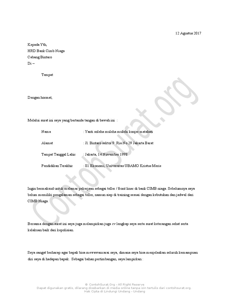 Contoh surat lamaran kerja atas inisiatif sendiri di bank. Contoh surat lamaran kerja di bank btpn di atas bisa anda kembangkan sendiri sesuai perihal yang di inginkan perusahaan apabila ada syarat syarat tambahan. Berikut adalah beberapa di antaranya. Contoh surat lamaran kerja di bank terbaru 2019 2020 antara surat lamaran lowongan kerja dan psikotes merupakan satu kesatuan yang. Terutama bagi anda yang ingin melamar pekerjaan di lembaga perbankan. Contoh surat lamaran kerja atas inisiatif sendiri di bank hingga dengan format dalam bahasa inggris yang terlihat profesional untuk anda gunakan dalam melamar pekerjaan. Related posts to contoh surat lamaran kerja atas inisiatif sendiri contoh surat lamaran kerja atas inisiatif sendiri 2019 10 06t041200 0700 rating.