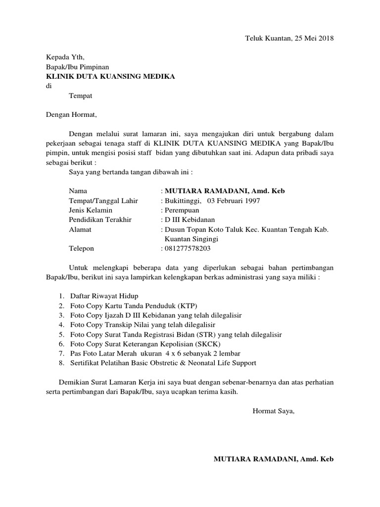 Contoh surat lamaran kerja bidan di bpm. Contoh surat lamaran kerja bidan di puskesmas. 8 contoh surat lamaran kerja bidan yang baik dan benar contoh surat lamaran kerja menjadi bidan ini dapat anda gunakan untuk melamar pekerjaan di berbagai tempat yang membuka lowongan pekerjaan mengenai bisan yang biasanya tersebar hampir di seluruh indonesia yang membutuhkan jasa sebagai bidan di setiap klinik atau rumah sakit ternama. Yogyakarta 11 mei 2019. Dengan hormat sehubungan dengan informasi lowongan kerja yang tercantum pada harian kedaulatan rakyat. Poin terakhir adalah jangan lupa untuk menyertakan nama lengkap dan tanda tangan kita. Contoh surat lamaran kerja sebagai bidan melamar bekerja sebagai perawat atau bidan di puskesmas klinik rumah sakit bisa melalui surat lamaran kerja dan daftar riwayat hidup.