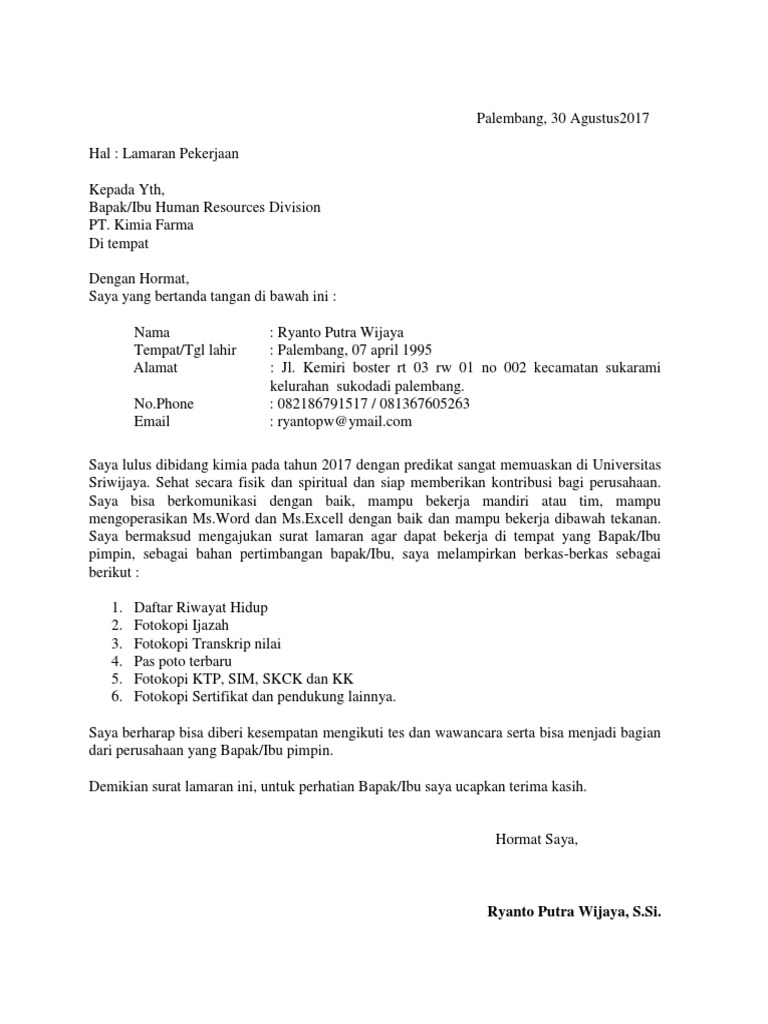 Berdasarkan informasi lowongan pekerjaan dari pt kimia farma yang termuat di harian jawa pos edisi sabtu tanggal 23 november 2018 saya yang bertandatangan di bawah ini. 135 semarang dengan hormat. Nah jika anda juga berencana melamar pekerjaan di perusahaan maka contoh surat lamaran kerja di persuahaan yang akan saya bagikan di bawah ini patut anda simak. Di dunia kerja pun tidak sedikit pekerjaan yang membutuhkan lulusan farmasi hal ini disebabkan dunia obat semakin hari semakin maju dengan pesat yang dikarenakan kepedulian masyarakat akan kesehatan berikut contoh surat lamaran kerja farmasi yang bisa anda jadikan sebagai bahan referensi untuk keperluan anda. Bagi yang masih bingung dengan bentuk surat lamaran kerja apotik anda jangan khawatir di postingan kali ini kami akan berbagi contoh surat lamaran yang bisa anda jadikan referensi dalam menulis surat lamaran untuk apotik khususnya bagi fresh graduate. Anda bisa mendownload atau mencetak gambar atau foto contoh surat lamaran.