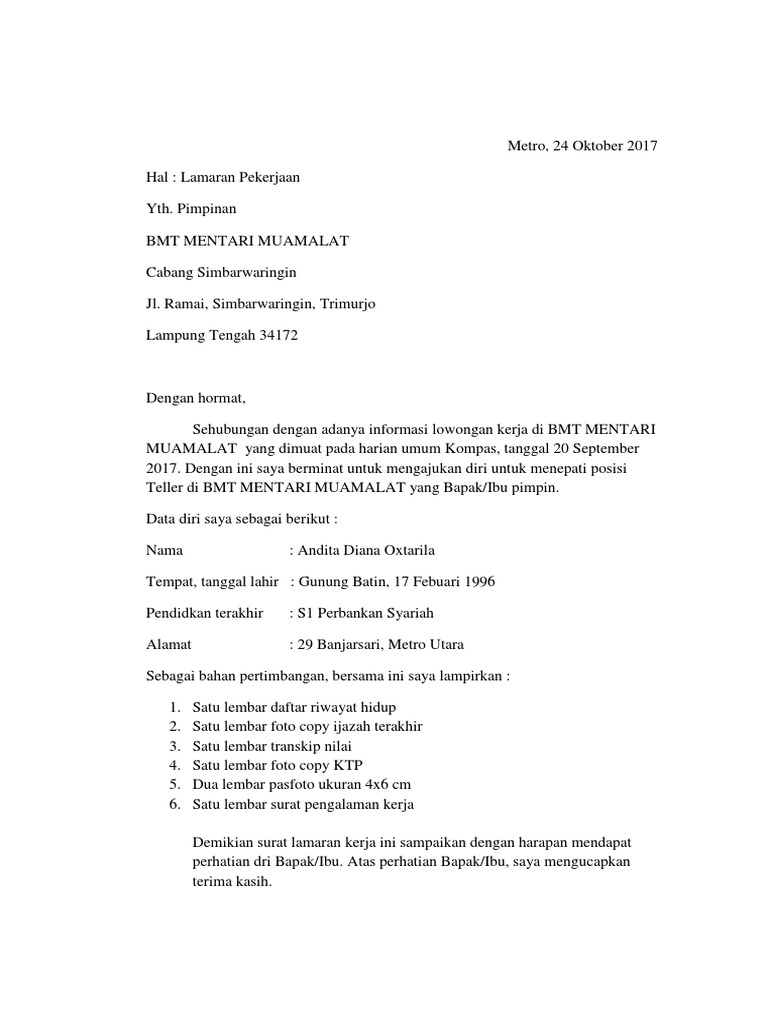 Contoh surat lamaran kerja di bmt. Nah jika anda juga berencana melamar pekerjaan di perusahaan maka contoh surat lamaran kerja di persuahaan yang akan saya bagikan di bawah ini patut anda simak. Contoh surat lamaran kerja yang baik dan benar sesuai dengan eyd ejaan yang disempurnakan untuk melamar pekerjaan di berbagai instansi baik bumn maupun swasta lengkap dengan filedoc siap untuk didownload dan diprint outcetak. Contoh surat lamaran kerja berdasaran iklan pertama adalah wajib menuliskan sumber informasi lowongan yang didapatkarena dengan begitu perusahaan telah dianggap sungguh sungguh dalam melamar pekerjaan. 15 contoh surat lamaran kerja di pt yang baik dan benar memiliki pekerjaan tetap tentunya menjadi dambaan setiap orang. Contoh surat contoh surat izin tidak masuk sekolah untuk anak. Contoh soal contoh soal laju reaksi un.