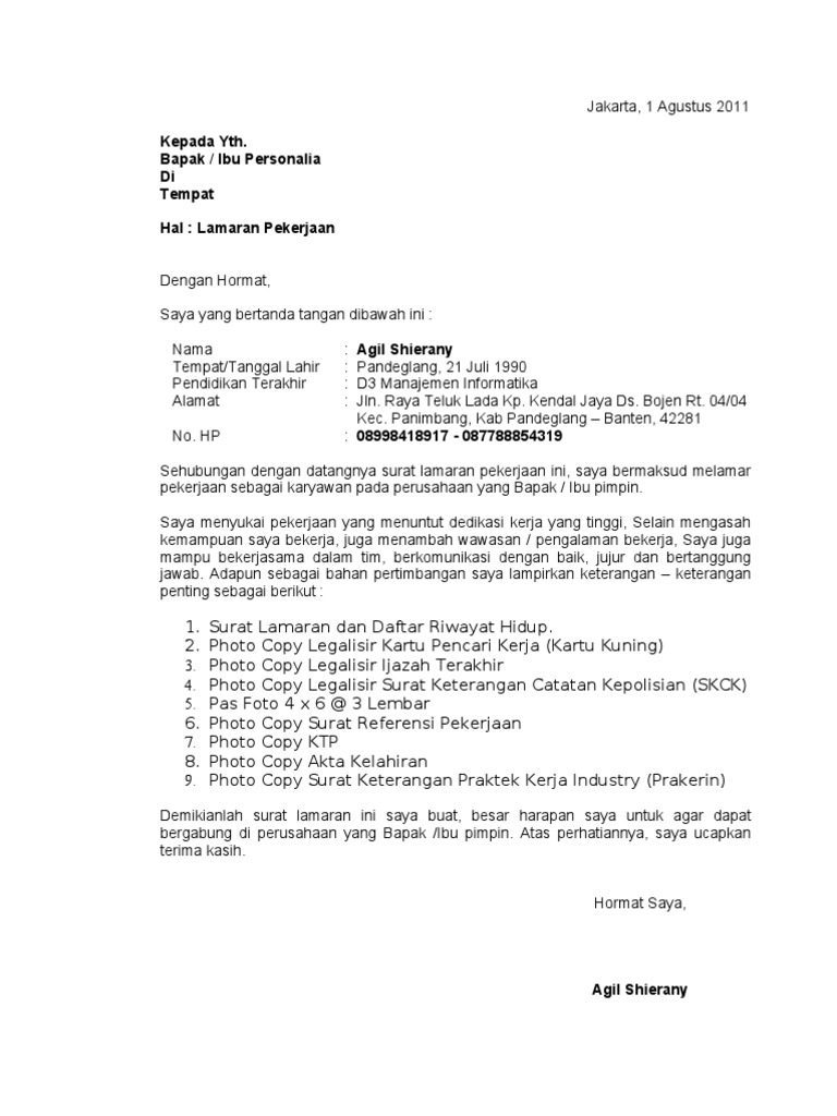 Format dari contoh surat lamaran kerja sangat mempengaruhi diterima tidaknya kita ketika sedang melamar di perusahaan. Tidak peduli apa tingkat pendidikannya atau pun keahlian apa yang dimiliki seseorang tersebut. Contoh surat lamaran kerja di perusahaan seringkali dicari oleh para pencari kerja yang ingin mengajukan lamaran pekerjaan di perusahaan perusahaan yang ada di indonesia. Contoh surat pengunduran diri dari hypermart contoh surat pengunduran diri adalah jenis surat yang banyak diperlukan saat ini baik di kantor ia bekerja maupun di sekolah sekolah juga organisasi tempat dia berkecimpung selama ini biasanya surat ini dibuat ketika akan mengembangkan kemampuan dan ilmunya di tempat lain atau juga bisa jadi karena sudah tidak cocok dengan tempatnya yang. Postingan ini jawaban jika anda mencari surat lamaran kerja skl yang pas dan mudah didownloadedit dengan microsoft word. Contoh surat lamaran kerja sebagai kasir jika kalian kesulitan dalam menulis surat lamaran kerja tenang saja karena di dalam tulisan ini akan membahas dan memberikan contoh surat lamaran kerja kasir jadi kalian tidak usah terlalu pusing untuk membuat surat lamaran kerja sebagai kasirtulisan ini ditunjukan bagi kalian yang memang memiliki minat dan ingin bekerja sebagai kasir di suatu.