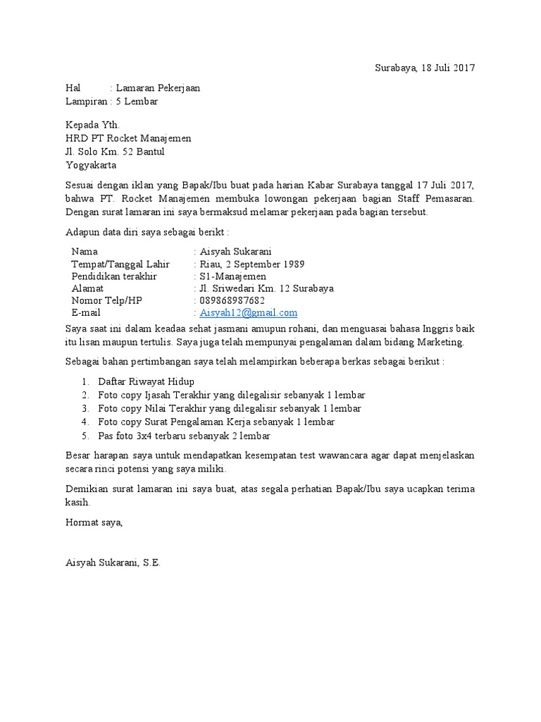 Tidak peduli apa tingkat pendidikannya atau pun keahlian apa yang dimiliki seseorang tersebut. Contoh surat lamaran kerja berdasaran iklan pertama adalah wajib menuliskan sumber informasi lowongan yang didapatkarena dengan begitu perusahaan telah dianggap sungguh sungguh dalam melamar pekerjaan. Pengertian surat lamaran kerja. Surat lamaran kerja adalah sebuat surat yang dibuat untuk keperluan permohonan bergabung atau bekerja di sebuah perusahaan dengan posisi atau jabatan sesusai dengan apa yang dibutuhkan oleh perusahan penyedia lowongan kerja. Baik itu iklan di media cetak surat kabar radio dan televisi. Nah bagi yang melamar pekerjaan karena mendapatkan informasi dari iklan bisa mencantumkan dari iklan mana informasi tersebut didapat.