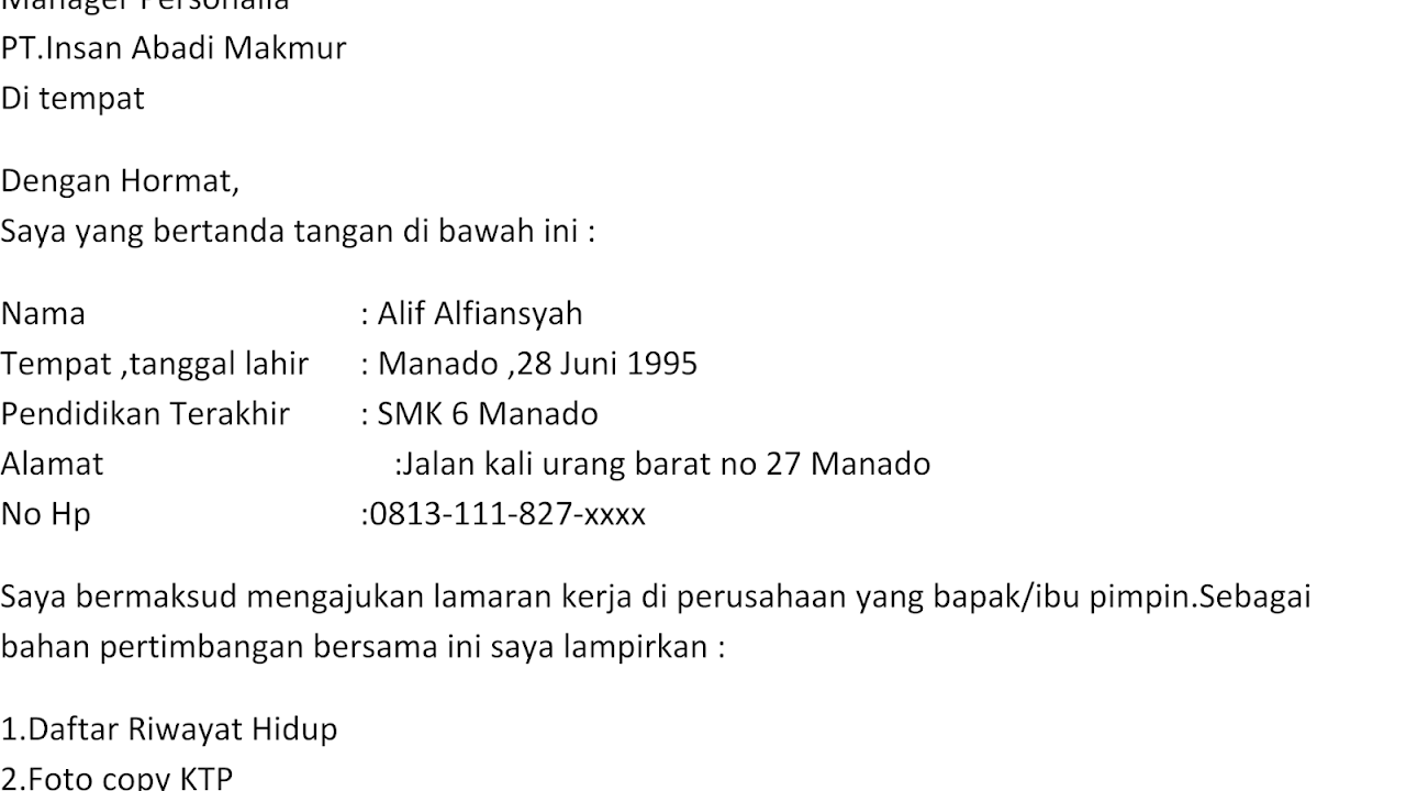 Artikel ini akan membantu anda memberikan kumpulan contoh yang sederhana simple dan aplikatif yang dapat memudahkan anda membuat surat lamaran pekerjaan dimana saja. Membuat surat lamaran tidak sembarang seperti membuat surat biasa ada format syarat serta trik yang harus dilakukan agar surat lamaran yang diajukan memenuhi kriteria untuk masuk pada proses selanjutnya. Contoh surat lamaran kerja salah satu persyaratan administrasi yang juga menjadi penentu lolos tidaknya berkas permohonan pekerjaan adalah surat lamaran. Namun seperti yang kita tahu saat ini mencari pekerjaan yang pas dan sesuai dengan keinginan kita tidaklah mudah. Berikut saya cantumkan biodata singkat saya. Sebelum kita lanjut ke contoh surat lamaran ada baiknya kamu membaca kriteria dan tips untuk membuat surat lamaran kerja yang baik dan benar.