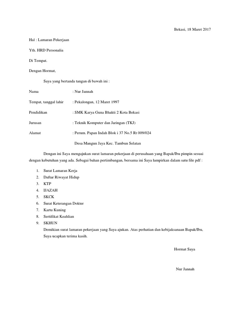 Contoh surat lamaran kerja lulusan smk jurusan tkj. 338 best contoh lamaran kerja dan cv. Siswa jurusan tkj dididik untuk mampu melakukan installasi jaringan komputer baik itu jaringan komputer dalam rumah kantor antar kantor antar kota. Contoh surat lamaran kerja yang baik dan benar adalah surat lamaran yang memenui kreteria standart surat pada umumnnya. Contoh surat lamaran kerja kasir dalam bahasa inggris contoh surat lamaran kerja dalam bahasa inggris beserta artinya contoh surat lamaran kerja umum contoh surat lamaran pekerjaan dalam bahasa inggris contoh surat lamaran kerja yang baik dan benar contoh surat lamaran kerja di bank contoh surat lamaran kerja di rumah sakit contoh surat pengalaman kerja. Oke sebelum membahas mengenai contoh surat lamaran kerja smk terlebih dahulu saya akan jelaskan tentang cara membuat surat lamaran kerja smk yang harus anda ketahui terlebih dahulu. Data data mengenai contoh surat lamaran kerja untuk lulusan smk jurusan tkj.