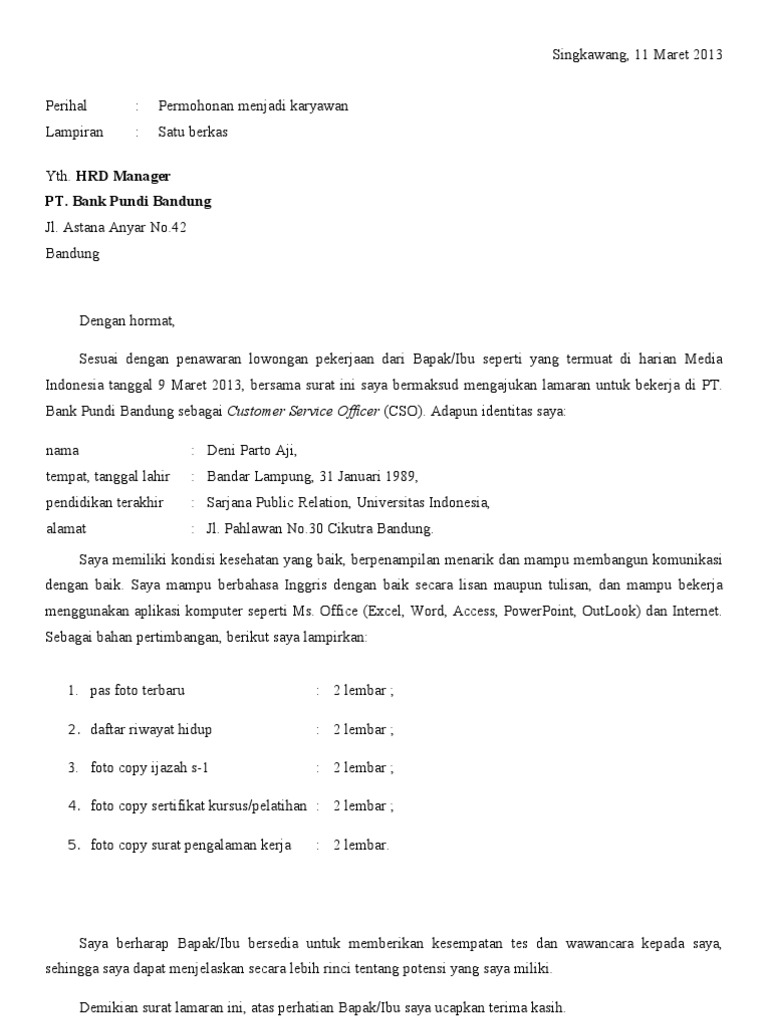 Contoh surat lamaran ditu lis tangan sendiri dengan huruf latin. Surat lamaran kerja menjadi salah satu poin penting yang dapat menentukan kelanjutan proses perekrutan kandidat di suatu perusahaan. Hrd pt nusantara jl.