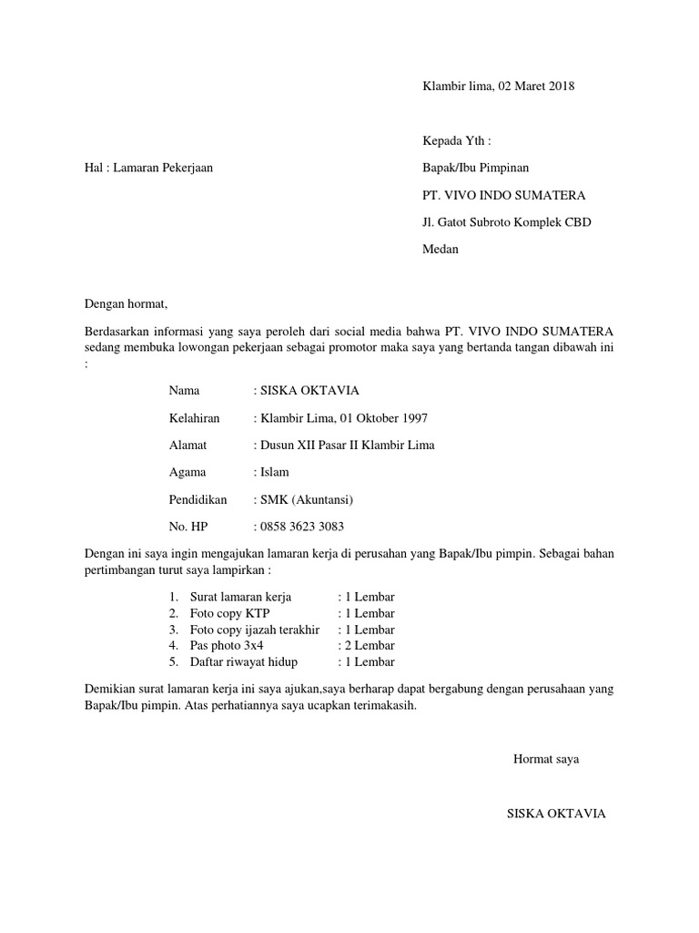 Contoh surat lamaran kerja promotor hp. Bandung dengan hormat berdasarkan informasi terkait adanya kesempatan untuk bergabung bersama kb tk alam raya sebagai guru saya mengajukan surat permohonan lamaran kerja. Tempat dan tanggal pembuatan surat nomor surat lampiran hal dan banyak lagi lainnya yang dibahas di artikel ini. Kepala sekolah kbtk alam raya. Bagi anda yang sedang mencari referensi surat melamar kerja lanjutkanlah membaca artikel ini hingga akhir. Contoh surat lamaran kerja di perusahaan seringkali dicari oleh para pencari kerja yang ingin mengajukan lamaran pekerjaan di perusahaan perusahaan yang ada di indonesia. Contoh surat lamaran kerja adalah suatu hal yang sangat dibutuhkan oleh para orang yang sedang mencari pekerjaan yang sesuai dengan keinginannya.