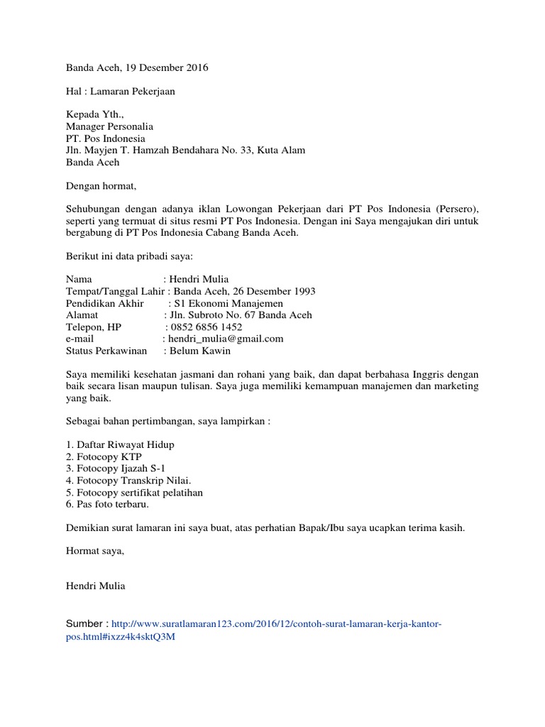 Contoh surat lamaran kerja yang baik dan benar sesuai dengan eyd ejaan yang disempurnakan untuk melamar pekerjaan di berbagai instansi baik bumn maupun swasta lengkap dengan filedoc siap untuk didownload dan diprint outcetak. Admin mengumpulkan dari berbagi sumber terkait contoh surat lamaran kerja pt pos indonesia.