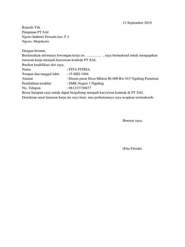 Contoh surat lamaran kerja adalah suatu hal yang sangat dibutuhkan oleh para orang yang sedang mencari pekerjaan yang sesuai dengan keinginannya. Baik mereka yang baru lulus kuliah s1 atapun mereka yang lulus sma atau smk tidak hanya mereka yang fresh graduate yang membutuhkan surat lamaran kerja mereka yang ingin pindah kerja juga membutuhkan surat lamaran kerja untuk tempat pekerjaan. Surat lamaran kerja adalah surat yang digunakan untuk melakukan permohonan mendapatkan pekerjaan sesuai pengalaman pada perusahaan tertentu. Informasi yang anda cari adalah contoh surat lamaran kerja di pt sai mojokertodibawah ini telah kami sajikan informasi lowongan kerja lulusan sma smk d3 s1 s2 semua jurusan lowongan bank bumn cpns dan swasta lainnya berdasarkan keterkaitan artikel ataupun keterkaitan iklan yang benar benar sesuai dengan kata kunci. Contoh surat lamaran kerja pt sai mojokerto tulisanviral. Contoh surat lamaran pt sai have an image associated with the othercontoh surat lamaran pt sai it also will include a picture of a kind that may be observed in the gallery of contoh surat lamaran pt sai.