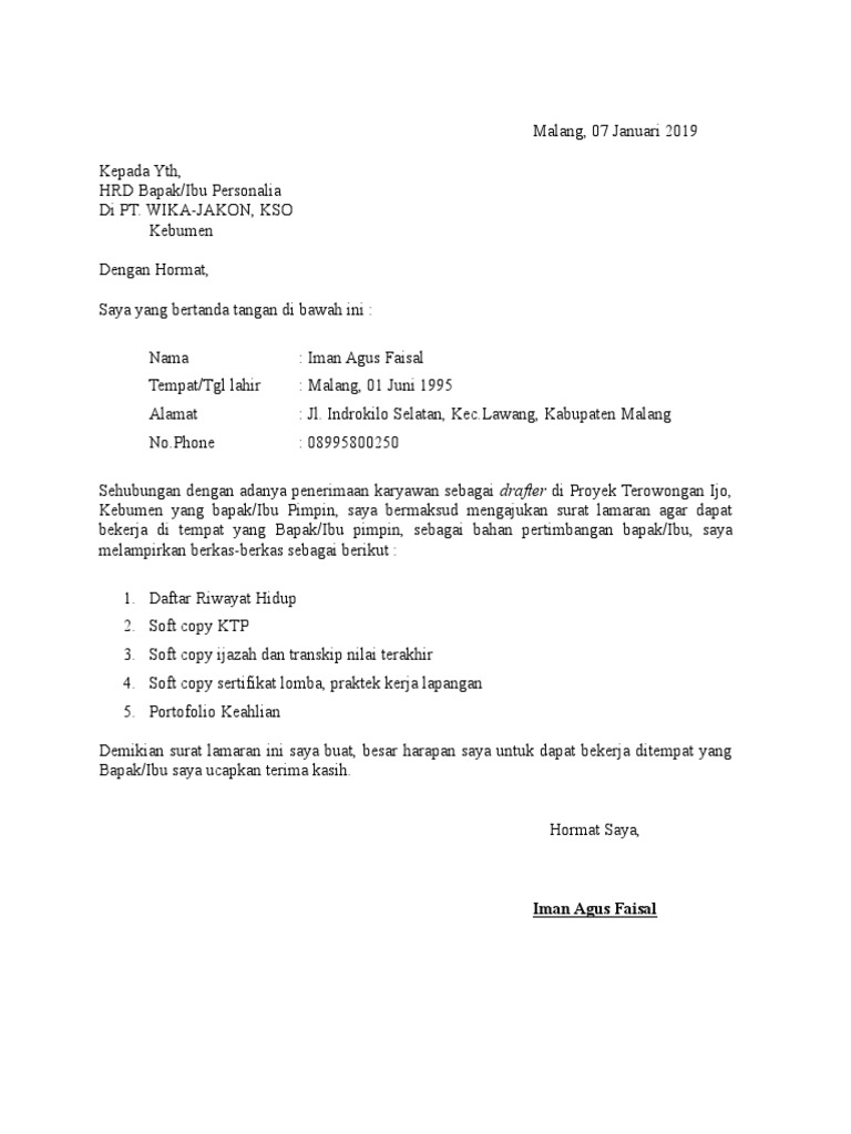 Contoh surat lamaran kerja pt wika. Tentu saja jika anda. Wika dan juga anda dapat mempelajarinya bagaiman membuat sebuah surat yang baik dan benar sehingga usaha anda tidak sia sia jika anda ingin menyampaikan nya melalui sebuah surat. Gambaran pekerjaan membuat agenda pekerjaan. Cara menulis surat lamaran kerja untuk lulusan sma sederajat adalah sebuah keharusan untuk menulis surat lamaran kerja secara baik dan benar. Tips menulis surat lamaran kerja yang efektif. Jika anda ingin membuat surat lamaran pekerjaan yang akan dikirim melalui e mail anda harus men scan terlebih dahulu berkas anda buat menjadi satu folder dengan ukuran maksimal 300kb atau sesuai kriteria yang diminta oleh perusahaan.