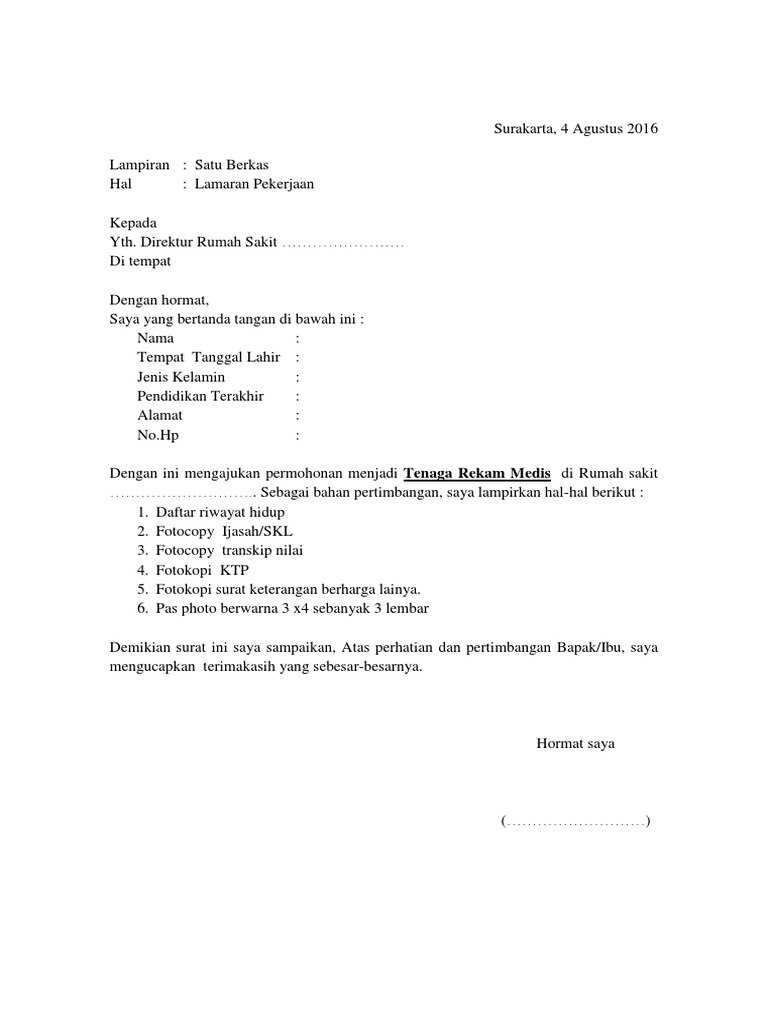 1 poin penting dalam surat lamaran kerja. Bahkan ada juga rumah sakit yang mewajibkan para pelamarnya harus merupakan tenaga tenaga medis yang sudah memiliki pengalaman. Apalagi jika kita akan mengambil bagian di tenaga medis tentu dibutuhkan pendidikan yang sesuai dengan bidangnya. Hal ini bisa kita buktikan dengan semakin banyaknya orang yang memilih jurusan kesehatan saat menempuh pendidikan tinggi. Contoh surat lamaran kerja rekam medis adalah gambar contoh surat berdefinisi tinggi dan memiliki ukuran 920x1600. Contoh surat lamaran kerja adalah suatu hal yang sangat dibutuhkan oleh para orang yang sedang mencari pekerjaan yang sesuai dengan keinginannya.