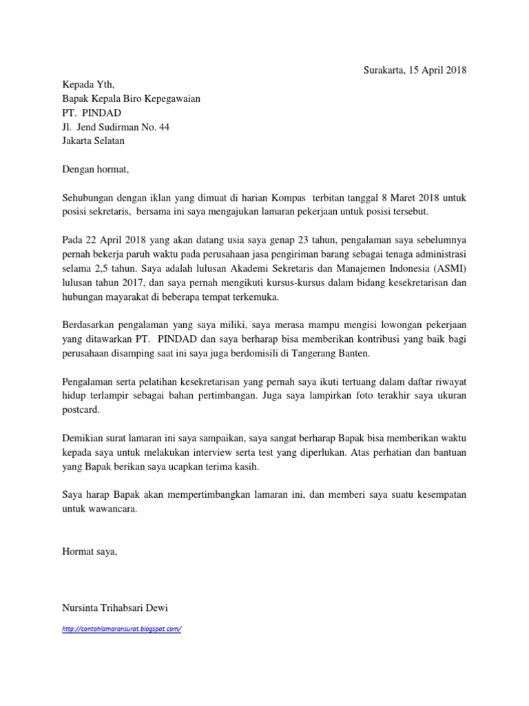 Contoh surat lamaran kerja sekretaris. Adapun pekerjaan seorang sekretaris adalah membantu seorang atasan dalam melaksanakan pekerjaannya baik itu selama di kantor maupun untuk menemani pekerjaan atau dinas ke luar kota. Contoh surat lamaran kerja surat lamaran yaitu sebuah surat yang dibentuk sesroang sebagai tanda ingin melamar kerja di sebuah instansi atau perusahaan. Contoh surat lamaran kerja dalam bahasa inggris posisi sekretaris pekerjaan sebagai seorang sekretaris biasanya banyak dilakoni oleh para kaum perempuan. 15 contoh surat lamaran kerja berdasarkan iklan paling lengkap salah satu sumber informasi tentang lowongan pekerjaan adalah melalui iklan. Surat lamaran kerja yang benar dan menarik sering menjadi hal yang membingungkan bagi pelamar. Tidak sedikit surat lamaran kerja yang berisi hanya sealakadarnya saja cenderung asal asalan dan hanya copy paste saja.