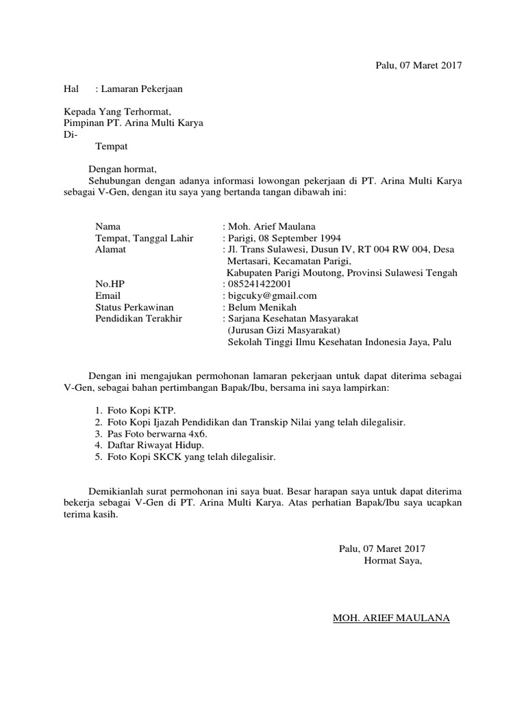 Contoh surat lamaran kerja berikut contoh surat lamaran pekerjaan yang bisa kamu download file dokumennya. Nah jika anda juga berencana melamar pekerjaan di perusahaan maka contoh surat lamaran kerja di persuahaan yang akan saya bagikan di bawah ini patut anda simak. Contoh surat lamaran kerja spg dan juga spb mall atau event seperti yang biasa kita lihat menggunakan bahasa indonesia atau inggris format cara pembuatanya memang sama saja namun yang menjadi berbeda adalah topik permohonan dari jabatan yang anda inginkan. Sebenarnya bentuk surat lamaran kerja menjadi spg tidak jauh berbeda dengan bentuk surat lamaran untuk posisi posisi yang lainnya di suatu perusahaan. Contoh surat lamaran kerja spg yang baik surat lamaran kerja merupakan sebuah surat yang di dalamnya berisikan permohonan agar bisa bekerja dan dengan di lengkapi berbagai macam persyaratan tertentu sesuai apa yang di minta oleh perusahaan yang membuka lowongan pekerjaan seperti skck surat kuning dan lainnya harus di lengkapi dengan sangat lengkap sekali. Contoh surat lamaran kerja di perusahaan seringkali dicari oleh para pencari kerja yang ingin mengajukan lamaran pekerjaan di perusahaan perusahaan yang ada di indonesia.