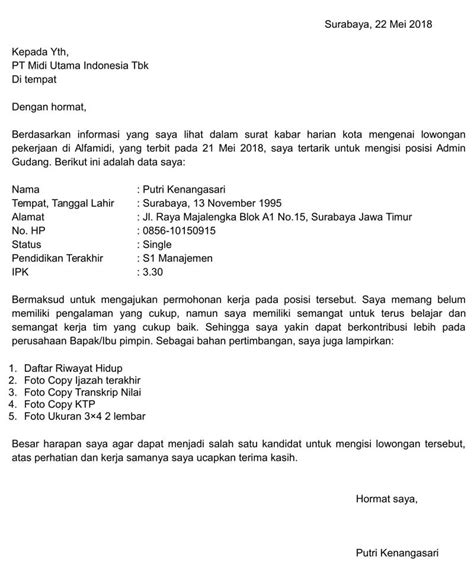 Surat lamaran kerja sangat dibutuhkan oleh semua kalangan guna melamar pekerjaan baru baik untuk yang baru lulus kuliah ingin pindah kerja karena bosan ditempat lama ataupun ingin mencari suasana baru ditempat kerja. Surat lamaran kerja alfamart adalah surat yang dibuat oleh seseorang untuk mengajukan lamaran pekerjaan dalam rangka mengisi salah satu posisi yang sedang dibutuhkan di perusahaan pt.